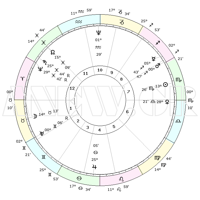 | | ΘΕΣΕΙΣ ΠΛΑΝΗΤΩΝ ΑΣΤΡΟΛΟΓΙΚΟΥ ΧΑΡΤΗ ΤΗΣ ΣΤΙΓΜΗΣ ΑΥΤΗΣ | | | | Πλανήτης | Ζώδιο | Μοίρες | Δεκαήμ. | Σε οίκο | Απόκλιση | | Ακμές των οίκων | | Ηλιος | Σκορπιός | 13°20' | Δεύτερο | 8 | 15 S 50 | | 1ος | 02°26' | Ιχθείς | | Σελήνη | Ταύρος | 12°41' | Δεύτερο | 2 | 19 N 39 | | 2ος | 17°39' | Κριός | | Ερμής | Τοξότης | 05°40' | Πρώτο | 9 | 23 S 59 | | 3ος | 19°53' | Ταύρος | | Αφροδίτη | Ζυγός | 28°13' | Τρίτο | 8 | 09 S 31 | | 4ος | 14°03' | Δίδυμοι | | Αρης | Τοξότης | 00°42' | Πρώτο | 9 | 20 S 43 | | 5ος | 05°44' | Καρκίνος | | Δίας | Καρκίνος | 25°05' | Τρίτο | 5 | 21 N 12 | | 6ος | 29°32' | Καρκίνος | | Κρόνος | Ιχθείς | 25°44'R | Τρίτο | 1 | 03 S 57 | | 7ος | 02°26' | Παρθένος | | Ουρανός | Δίδυμοι | 00°06'R | Πρώτο | 3 | 19 N 58 | | 8ος | 17°39' | Ζυγός | | Ποσειδώνας | Ιχθείς | 29°42'R | Τρίτο | 1 | 01 S 22 | | 9ος | 19°53' | Σκορπιός | | Πλούτωνας | Υδροχόος | 01°29' | Πρώτο | 12 | 23 S 30 | | 10ος | 14°03' | Τοξότης | | Β. Δεσμός | Ιχθείς | 15°10' | Δεύτερο | 1 | 05 S 51 | | 11ος | 05°44' | Αιγόκερως | | Ωροσκόπος | Ιχθείς | 02°26' | Πρώτο | | | 12ος | 29°32' | Αιγόκερως | | Μεσουράνημα | Τοξότης | 14°03' | Δεύτερο | | | |