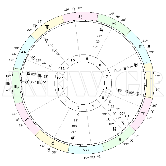 | ΘΕΣΕΙΣ ΠΛΑΝΗΤΩΝ ΑΣΤΡΟΛΟΓΙΚΟΥ ΧΑΡΤΗ ΤΗΣ ΣΤΙΓΜΗΣ ΑΥΤΗΣ | | Πλανήτης | Ζώδιο | Μοίρες | Δεκαήμ. | Σε οίκο | Απόκλιση | | Ακμές των οίκων | Ηλιος | Ζυγός | 15°10' | Δεύτερο | 12 | 05 S 58 | | 1ος | 19°36' | Ζυγός | Σελήνη | Κριός | 29°46' | Τρίτο | 7 | 14 N 38 | | 2ος | 17°25' | Σκορπιός | Ερμής | Σκορπιός | 02°16' | Πρώτο | 1 | 13 S 10 | | 3ος | 18°41' | Τοξότης | Αφροδίτη | Παρθένος | 22°58' | Τρίτο | 11 | 04 N 06 | | 4ος | 22°16' | Αιγόκερως | Αρης | Σκορπιός | 10°48' | Δεύτερο | 1 | 15 S 13 | | 5ος | 25°13' | Υδροχόος | Δίας | Καρκίνος | 23°17' | Τρίτο | 10 | 21 N 28 | | 6ος | 24°41' | Ιχθείς | Κρόνος | Ιχθείς | 27°21'R | Τρίτο | 6 | 03 S 21 | | 7ος | 19°36' | Κριός | Ουρανός | Δίδυμοι | 01°03'R | Πρώτο | 8 | 20 N 09 | | 8ος | 17°25' | Ταύρος | Ποσειδώνας | Κριός | 00°21'R | Πρώτο | 6 | 01 S 07 | | 9ος | 18°41' | Δίδυμοι | Πλούτωνας | Υδροχόος | 01°22'R | Πρώτο | 4 | 23 S 32 | | 10ος | 22°16' | Καρκίνος | Β. Δεσμός | Ιχθείς | 16°40' | Δεύτερο | 5 | 05 S 16 | | 11ος | 25°13' | Λέων | Ωροσκόπος | Ζυγός | 19°36' | Δεύτερο | | | 12ος | 24°41' | Παρθένος | Μεσουράνημα | Καρκίνος | 22°16' | Τρίτο | | | |
