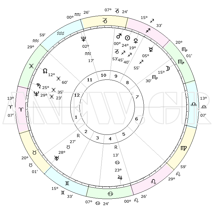 | | ΘΕΣΕΙΣ ΠΛΑΝΗΤΩΝ ΑΣΤΡΟΛΟΓΙΚΟΥ ΧΑΡΤΗ ΤΗΣ ΣΤΙΓΜΗΣ ΑΥΤΗΣ | | | | Πλανήτης | Ζώδιο | Μοίρες | Δεκαήμ. | Σε οίκο | Απόκλιση | | Ακμές των οίκων | | Ηλιος | Τοξότης | 24°35' | Τρίτο | 11 | 23 S 19 | | 1ος | 17°17' | Αιγόκερως | | Σελήνη | Σκορπιός | 13°30' | Δεύτερο | 10 | 20 S 03 | | 2ος | 28°47' | Υδροχόος | | Ερμής | Τοξότης | 05°41' | Πρώτο | 11 | 19 S 54 | | 3ος | 08°45' | Κριός | | Αφροδίτη | Τοξότης | 19°27' | Δεύτερο | 11 | 22 S 54 | | 4ος | 09°33' | Ταύρος | | Αρης | Αιγόκερως | 00°45' | Πρώτο | 12 | 24 S 13 | | 5ος | 03°29' | Δίδυμοι | | Δίας | Καρκίνος | 23°14'R | Τρίτο | 7 | 21 N 38 | | 6ος | 24°42' | Δίδυμοι | | Κρόνος | Ιχθείς | 25°34' | Τρίτο | 2 | 03 S 53 | | 7ος | 17°17' | Καρκίνος | | Ουρανός | Ταύρος | 28°27'R | Τρίτο | 4 | 19 N 37 | | 8ος | 28°47' | Λέων | | Ποσειδώνας | Ιχθείς | 29°23' | Τρίτο | 2 | 01 S 29 | | 9ος | 08°45' | Ζυγός | | Πλούτωνας | Υδροχόος | 02°16' | Πρώτο | 1 | 23 S 19 | | 10ος | 09°33' | Σκορπιός | | Β. Δεσμός | Ιχθείς | 13°00' | Δεύτερο | 2 | 06 S 41 | | 11ος | 03°29' | Τοξότης | | Ωροσκόπος | Αιγόκερως | 17°17' | Δεύτερο | | | 12ος | 24°42' | Τοξότης | | Μεσουράνημα | Σκορπιός | 09°33' | Πρώτο | | | |