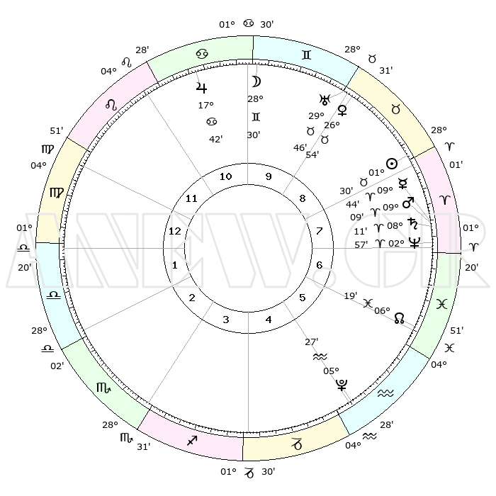 | | ΘΕΣΕΙΣ ΠΛΑΝΗΤΩΝ ΑΣΤΡΟΛΟΓΙΚΟΥ ΧΑΡΤΗ ΤΗΣ ΣΤΙΓΜΗΣ ΑΥΤΗΣ | | | | Πλανήτης | Ζώδιο | Μοίρες | Δεκαήμ. | Σε οίκο | Απόκλιση | | Ακμές των οίκων | | Ηλιος | Ταύρος | 01°27' | Πρώτο | 8 | 11 N 58 | | 1ος | 11°55' | Παρθένος | | Σελήνη | Δίδυμοι | 27°32' | Τρίτο | 10 | 28 N 12 | | 2ος | 06°58' | Ζυγός | | Ερμής | Κριός | 09°37' | Πρώτο | 8 | 01 N 26 | | 3ος | 06°33' | Σκορπιός | | Αφροδίτη | Ταύρος | 26°49' | Τρίτο | 9 | 19 N 54 | | 4ος | 09°30' | Τοξότης | | Αρης | Κριός | 09°06' | Πρώτο | 8 | 02 N 44 | | 5ος | 12°60' | Αιγόκερως | | Δίας | Καρκίνος | 17°42' | Δεύτερο | 11 | 22 N 39 | | 6ος | 14°11' | Υδροχόος | | Κρόνος | Κριός | 08°10' | Πρώτο | 8 | 01 N 16 | | 7ος | 11°55' | Ιχθείς | | Ουρανός | Ταύρος | 29°46' | Τρίτο | 9 | 19 N 56 | | 8ος | 06°58' | Κριός | | Ποσειδώνας | Κριός | 02°57' | Πρώτο | 7 | 00 S 02 | | 9ος | 06°33' | Ταύρος | | Πλούτωνας | Υδροχόος | 05°27' | Πρώτο | 5 | 22 S 48 | | 10ος | 09°30' | Δίδυμοι | | Β. Δεσμός | Ιχθείς | 06°19' | Πρώτο | 6 | 09 S 12 | | 11ος | 12°60' | Καρκίνος | | Ωροσκόπος | Παρθένος | 11°55' | Δεύτερο | | | 12ος | 14°11' | Λέων | | Μεσουράνημα | Δίδυμοι | 09°30' | Πρώτο | | | |