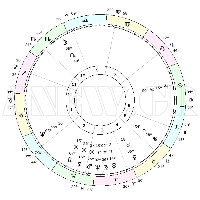 | | ΘΕΣΕΙΣ ΠΛΑΝΗΤΩΝ ΑΣΤΡΟΛΟΓΙΚΟΥ ΧΑΡΤΗ ΤΗΣ ΣΤΙΓΜΗΣ ΑΥΤΗΣ | | | | Πλανήτης | Ζώδιο | Μοίρες | Δεκαήμ. | Σε οίκο | Απόκλιση | | Ακμές των οίκων | | Ηλιος | Κριός | 14°09' | Δεύτερο | 4 | 05 N 35 | | 1ος | 15°03' | Τοξότης | | Σελήνη | Σκορπιός | 04°55' | Πρώτο | 11 | 17 S 13 | | 2ος | 18°44' | Αιγόκερως | | Ερμής | Ιχθείς | 16°23' | Δεύτερο | 3 | 06 S 58 | | 3ος | 26°57' | Υδροχόος | | Αφροδίτη | Ταύρος | 05°14' | Πρώτο | 5 | 12 N 57 | | 4ος | 02°40' | Κριός | | Αρης | Ιχθείς | 25°24' | Τρίτο | 3 | 02 S 47 | | 5ος | 01°28' | Ταύρος | | Δίας | Καρκίνος | 15°59' | Δεύτερο | 7 | 22 N 51 | | 6ος | 24°37' | Ταύρος | | Κρόνος | Κριός | 06°01' | Πρώτο | 4 | 00 N 26 | | 7ος | 15°03' | Δίδυμοι | | Ουρανός | Ταύρος | 28°54' | Τρίτο | 6 | 19 N 44 | | 8ος | 18°44' | Καρκίνος | | Ποσειδώνας | Κριός | 02°19' | Πρώτο | 3 | 00 S 17 | | 9ος | 26°57' | Λέων | | Πλούτωνας | Υδροχόος | 05°16' | Πρώτο | 2 | 22 S 47 | | 10ος | 02°40' | Ζυγός | | Β. Δεσμός | Ιχθείς | 07°15' | Πρώτο | 3 | 08 S 51 | | 11ος | 01°28' | Σκορπιός | | Ωροσκόπος | Τοξότης | 15°03' | Δεύτερο | | | 12ος | 24°37' | Σκορπιός | | Μεσουράνημα | Ζυγός | 02°40' | Πρώτο | | | |
