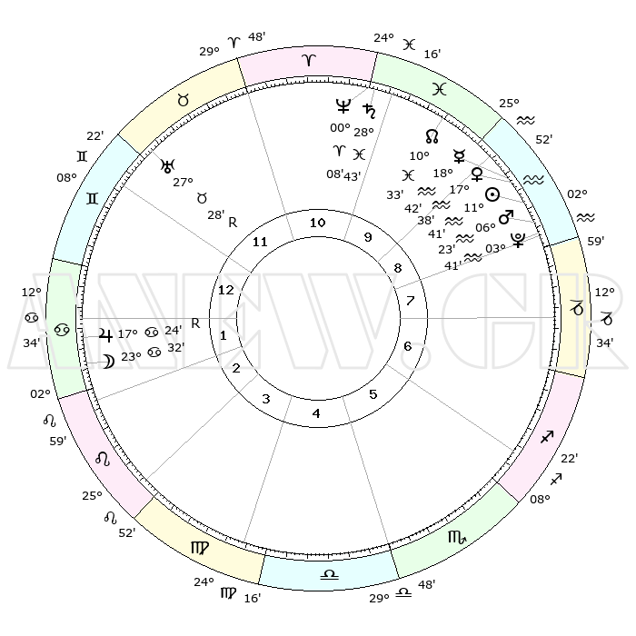 | | ΘΕΣΕΙΣ ΠΛΑΝΗΤΩΝ ΑΣΤΡΟΛΟΓΙΚΟΥ ΧΑΡΤΗ ΤΗΣ ΣΤΙΓΜΗΣ ΑΥΤΗΣ | | | | Πλανήτης | Ζώδιο | Μοίρες | Δεκαήμ. | Σε οίκο | Απόκλιση | | Ακμές των οίκων | | Ηλιος | Υδροχόος | 11°37' | Δεύτερο | 9 | 17 S 18 | | 1ος | 23°35' | Δίδυμοι | | Σελήνη | Καρκίνος | 22°41' | Τρίτο | 2 | 25 N 15 | | 2ος | 14°52' | Καρκίνος | | Ερμής | Υδροχόος | 18°36' | Δεύτερο | 9 | 17 S 04 | | 3ος | 06°20' | Λέων | | Αφροδίτη | Υδροχόος | 17°34' | Δεύτερο | 9 | 16 S 51 | | 4ος | 01°40' | Παρθένος | | Αρης | Υδροχόος | 06°21' | Πρώτο | 9 | 19 S 41 | | 5ος | 04°31' | Ζυγός | | Δίας | Καρκίνος | 17°25'R | Δεύτερο | 2 | 22 N 36 | | 6ος | 14°48' | Σκορπιός | | Κρόνος | Ιχθείς | 28°42' | Τρίτο | 10 | 02 S 31 | | 7ος | 23°35' | Τοξότης | | Ουρανός | Ταύρος | 27°28'R | Τρίτο | 12 | 19 N 24 | | 8ος | 14°52' | Αιγόκερως | | Ποσειδώνας | Κριός | 00°08' | Πρώτο | 10 | 01 S 09 | | 9ος | 06°20' | Υδροχόος | | Πλούτωνας | Υδροχόος | 03°41' | Πρώτο | 8 | 23 S 01 | | 10ος | 01°40' | Ιχθείς | | Β. Δεσμός | Ιχθείς | 10°33' | Δεύτερο | 10 | 07 S 36 | | 11ος | 04°31' | Κριός | | Ωροσκόπος | Δίδυμοι | 23°35' | Τρίτο | | | 12ος | 14°48' | Ταύρος | | Μεσουράνημα | Ιχθείς | 01°40' | Πρώτο | | | |