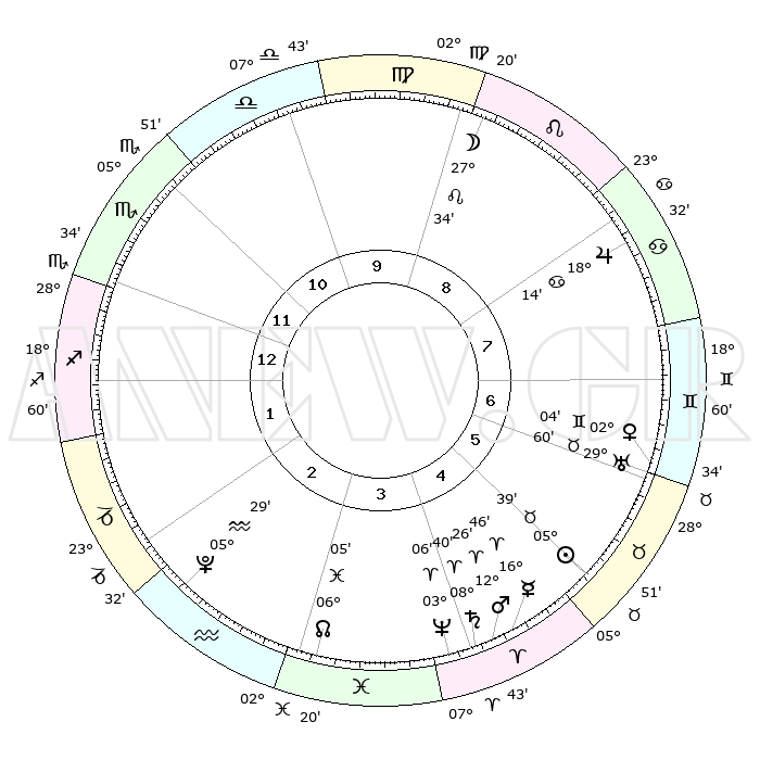 | | ΘΕΣΕΙΣ ΠΛΑΝΗΤΩΝ ΑΣΤΡΟΛΟΓΙΚΟΥ ΧΑΡΤΗ ΤΗΣ ΣΤΙΓΜΗΣ ΑΥΤΗΣ | | | | Πλανήτης | Ζώδιο | Μοίρες | Δεκαήμ. | Σε οίκο | Απόκλιση | | Ακμές των οίκων | | Ηλιος | Ταύρος | 05°36' | Πρώτο | 5 | 13 N 23 | | 1ος | 01°04' | Τοξότης | | Σελήνη | Λέων | 26°46' | Τρίτο | 9 | 13 N 28 | | 2ος | 02°20' | Αιγόκερως | | Ερμής | Κριός | 16°40' | Δεύτερο | 5 | 04 N 21 | | 3ος | 08°13' | Υδροχόος | | Αφροδίτη | Δίδυμοι | 01°60' | Πρώτο | 7 | 21 N 12 | | 4ος | 14°17' | Ιχθείς | | Αρης | Κριός | 12°23' | Δεύτερο | 4 | 04 N 03 | | 5ος | 15°11' | Κριός | | Δίας | Καρκίνος | 18°13' | Δεύτερο | 8 | 22 N 35 | | 6ος | 10°05' | Ταύρος | | Κρόνος | Κριός | 08°40' | Πρώτο | 4 | 01 N 27 | | 7ος | 01°04' | Δίδυμοι | | Ουρανός | Ταύρος | 29°59' | Τρίτο | 6 | 19 N 59 | | 8ος | 02°20' | Καρκίνος | | Ποσειδώνας | Κριός | 03°06' | Πρώτο | 4 | 00 N 01 | | 9ος | 08°13' | Λέων | | Πλούτωνας | Υδροχόος | 05°29' | Πρώτο | 2 | 22 S 48 | | 10ος | 14°17' | Παρθένος | | Β. Δεσμός | Ιχθείς | 06°05' | Πρώτο | 3 | 09 S 17 | | 11ος | 15°11' | Ζυγός | | Ωροσκόπος | Τοξότης | 01°04' | Πρώτο | | | 12ος | 10°05' | Σκορπιός | | Μεσουράνημα | Παρθένος | 14°17' | Δεύτερο | | | |