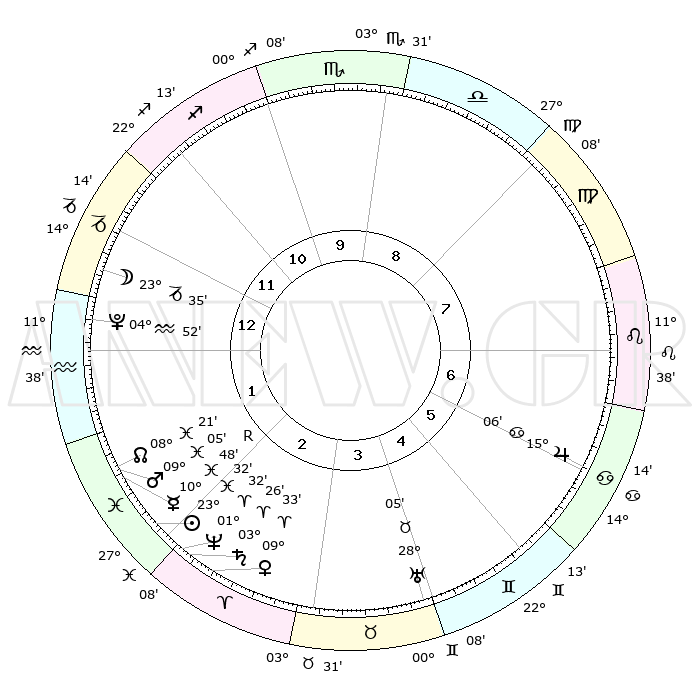 | | ΘΕΣΕΙΣ ΠΛΑΝΗΤΩΝ ΑΣΤΡΟΛΟΓΙΚΟΥ ΧΑΡΤΗ ΤΗΣ ΣΤΙΓΜΗΣ ΑΥΤΗΣ | | | | Πλανήτης | Ζώδιο | Μοίρες | Δεκαήμ. | Σε οίκο | Απόκλιση | | Ακμές των οίκων | | Ηλιος | Ιχθείς | 23°28' | Τρίτο | 2 | 02 S 36 | | 1ος | 11°37' | Αιγόκερως | | Σελήνη | Αιγόκερως | 22°41' | Τρίτο | 1 | 25 S 17 | | 2ος | 21°45' | Υδροχόος | | Ερμής | Ιχθείς | 10°51'R | Δεύτερο | 2 | 05 S 03 | | 3ος | 02°00' | Κριός | | Αφροδίτη | Κριός | 09°27' | Πρώτο | 3 | 02 N 45 | | 4ος | 03°53' | Ταύρος | | Αρης | Ιχθείς | 09°02' | Πρώτο | 2 | 09 S 11 | | 5ος | 28°30' | Ταύρος | | Δίας | Καρκίνος | 15°06' | Δεύτερο | 7 | 22 N 56 | | 6ος | 19°47' | Δίδυμοι | | Κρόνος | Κριός | 03°26' | Πρώτο | 3 | 00 S 35 | | 7ος | 11°37' | Καρκίνος | | Ουρανός | Ταύρος | 28°05' | Τρίτο | 4 | 19 N 33 | | 8ος | 21°45' | Λέων | | Ποσειδώνας | Κριός | 01°32' | Πρώτο | 2 | 00 S 35 | | 9ος | 02°00' | Ζυγός | | Πλούτωνας | Υδροχόος | 04°52' | Πρώτο | 1 | 22 S 50 | | 10ος | 03°53' | Σκορπιός | | Β. Δεσμός | Ιχθείς | 08°21' | Πρώτο | 2 | 08 S 26 | | 11ος | 28°30' | Σκορπιός | | Ωροσκόπος | Αιγόκερως | 11°37' | Δεύτερο | | | 12ος | 19°47' | Τοξότης | | Μεσουράνημα | Σκορπιός | 03°53' | Πρώτο | | | |
