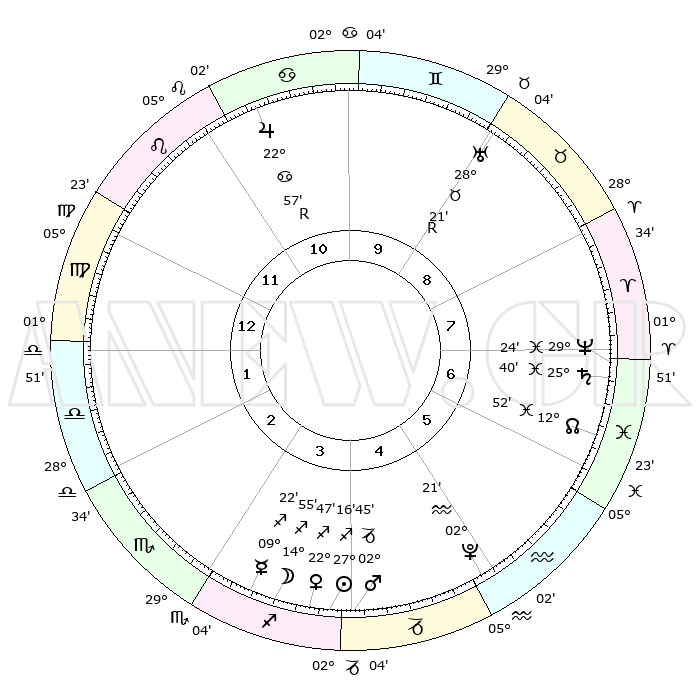 | | ΘΕΣΕΙΣ ΠΛΑΝΗΤΩΝ ΑΣΤΡΟΛΟΓΙΚΟΥ ΧΑΡΤΗ ΤΗΣ ΣΤΙΓΜΗΣ ΑΥΤΗΣ | | | | Πλανήτης | Ζώδιο | Μοίρες | Δεκαήμ. | Σε οίκο | Απόκλιση | | Ακμές των οίκων | | Ηλιος | Τοξότης | 26°51' | Τρίτο | 8 | 23 S 24 | | 1ος | 16°27' | Ταύρος | | Σελήνη | Τοξότης | 09°54' | Πρώτο | 7 | 26 S 52 | | 2ος | 14°19' | Δίδυμοι | | Ερμής | Τοξότης | 08°46' | Πρώτο | 7 | 20 S 41 | | 3ος | 06°28' | Καρκίνος | | Αφροδίτη | Τοξότης | 22°16' | Τρίτο | 8 | 23 S 11 | | 4ος | 28°29' | Καρκίνος | | Αρης | Αιγόκερως | 02°26' | Πρώτο | 8 | 24 S 13 | | 5ος | 24°50' | Λέων | | Δίας | Καρκίνος | 22°59'R | Τρίτο | 3 | 21 N 41 | | 6ος | 00°50' | Ζυγός | | Κρόνος | Ιχθείς | 25°39' | Τρίτο | 11 | 03 S 51 | | 7ος | 16°27' | Σκορπιός | | Ουρανός | Ταύρος | 28°22'R | Τρίτο | 1 | 19 N 36 | | 8ος | 14°19' | Τοξότης | | Ποσειδώνας | Ιχθείς | 29°24' | Τρίτο | 11 | 01 S 28 | | 9ος | 06°28' | Αιγόκερως | | Πλούτωνας | Υδροχόος | 02°20' | Πρώτο | 10 | 23 S 18 | | 10ος | 28°29' | Αιγόκερως | | Β. Δεσμός | Ιχθείς | 12°53' | Δεύτερο | 11 | 06 S 43 | | 11ος | 24°50' | Υδροχόος | | Ωροσκόπος | Ταύρος | 16°27' | Δεύτερο | | | 12ος | 00°50' | Κριός | | Μεσουράνημα | Αιγόκερως | 28°29' | Τρίτο | | | |