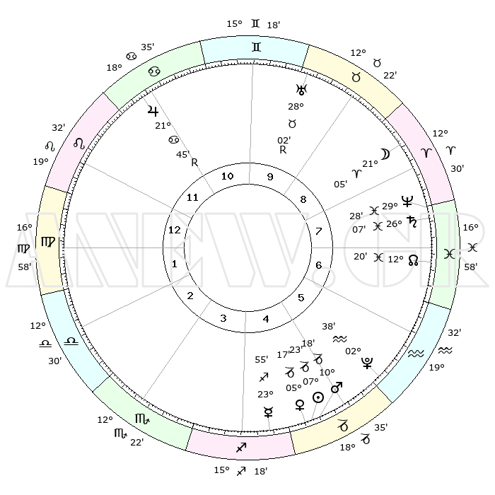 | | ΘΕΣΕΙΣ ΠΛΑΝΗΤΩΝ ΑΣΤΡΟΛΟΓΙΚΟΥ ΧΑΡΤΗ ΤΗΣ ΣΤΙΓΜΗΣ ΑΥΤΗΣ | | | | Πλανήτης | Ζώδιο | Μοίρες | Δεκαήμ. | Σε οίκο | Απόκλιση | | Ακμές των οίκων | | Ηλιος | Αιγόκερως | 07°18' | Πρώτο | 5 | 23 S 14 | | 1ος | 26°40' | Λέων | | Σελήνη | Κριός | 20°07' | Τρίτο | 9 | 10 N 49 | | 2ος | 20°10' | Παρθένος | | Ερμής | Τοξότης | 23°49' | Τρίτο | 4 | 23 S 30 | | 3ος | 18°32' | Ζυγός | | Αφροδίτη | Αιγόκερως | 05°11' | Πρώτο | 5 | 23 S 43 | | 4ος | 21°24' | Σκορπιός | | Αρης | Αιγόκερως | 10°15' | Δεύτερο | 5 | 23 S 54 | | 5ος | 25°49' | Τοξότης | | Δίας | Καρκίνος | 21°46'R | Τρίτο | 11 | 21 N 54 | | 6ος | 28°03' | Αιγόκερως | | Κρόνος | Ιχθείς | 26°06' | Τρίτο | 8 | 03 S 38 | | 7ος | 26°40' | Υδροχόος | | Ουρανός | Ταύρος | 28°02'R | Τρίτο | 10 | 19 N 31 | | 8ος | 20°10' | Ιχθείς | | Ποσειδώνας | Ιχθείς | 29°28' | Τρίτο | 8 | 01 S 26 | | 9ος | 18°32' | Κριός | | Πλούτωνας | Υδροχόος | 02°38' | Πρώτο | 6 | 23 S 14 | | 10ος | 21°24' | Ταύρος | | Β. Δεσμός | Ιχθείς | 12°20' | Δεύτερο | 7 | 06 S 56 | | 11ος | 25°49' | Δίδυμοι | | Ωροσκόπος | Λέων | 26°40' | Τρίτο | | | 12ος | 28°03' | Καρκίνος | | Μεσουράνημα | Ταύρος | 21°24' | Τρίτο | | | |