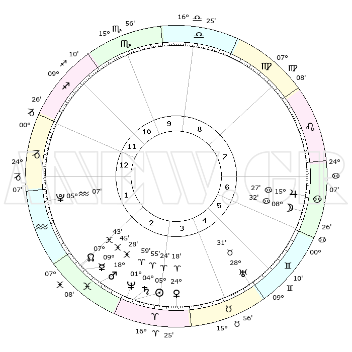 | | ΘΕΣΕΙΣ ΠΛΑΝΗΤΩΝ ΑΣΤΡΟΛΟΓΙΚΟΥ ΧΑΡΤΗ ΤΗΣ ΣΤΙΓΜΗΣ ΑΥΤΗΣ | | | | Πλανήτης | Ζώδιο | Μοίρες | Δεκαήμ. | Σε οίκο | Απόκλιση | | Ακμές των οίκων | | Ηλιος | Κριός | 05°20' | Πρώτο | 3 | 02 N 07 | | 1ος | 00°36' | Αιγόκερως | | Σελήνη | Καρκίνος | 07°38' | Πρώτο | 7 | 27 N 47 | | 2ος | 07°55' | Υδροχόος | | Ερμής | Ιχθείς | 09°43' | Πρώτο | 2 | 08 S 06 | | 3ος | 17°57' | Ιχθείς | | Αφροδίτη | Κριός | 24°14' | Τρίτο | 4 | 08 N 46 | | 4ος | 21°48' | Κριός | | Αρης | Ιχθείς | 18°25' | Δεύτερο | 3 | 05 S 34 | | 5ος | 18°01' | Ταύρος | | Δίας | Καρκίνος | 15°26' | Δεύτερο | 7 | 22 N 54 | | 6ος | 09°47' | Δίδυμοι | | Κρόνος | Κριός | 04°55' | Πρώτο | 3 | 00 S 00 | | 7ος | 00°36' | Καρκίνος | | Ουρανός | Ταύρος | 28°31' | Τρίτο | 5 | 19 N 39 | | 8ος | 07°55' | Λέων | | Ποσειδώνας | Κριός | 01°59' | Πρώτο | 3 | 00 S 25 | | 9ος | 17°57' | Παρθένος | | Πλούτωνας | Υδροχόος | 05°07' | Πρώτο | 1 | 22 S 48 | | 10ος | 21°48' | Ζυγός | | Β. Δεσμός | Ιχθείς | 07°43' | Πρώτο | 2 | 08 S 40 | | 11ος | 18°01' | Σκορπιός | | Ωροσκόπος | Αιγόκερως | 00°36' | Πρώτο | | | 12ος | 09°47' | Τοξότης | | Μεσουράνημα | Ζυγός | 21°48' | Τρίτο | | | |