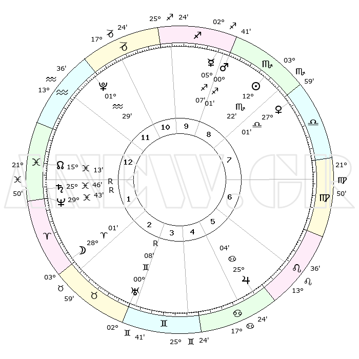 |  | ΘΕΣΕΙΣ ΠΛΑΝΗΤΩΝ ΑΣΤΡΟΛΟΓΙΚΟΥ ΧΑΡΤΗ ΤΗΣ ΣΤΙΓΜΗΣ ΑΥΤΗΣ |  |   |  | Πλανήτης | Ζώδιο | Μοίρες | Δεκαήμ. | Σε οίκο | Απόκλιση |   | Ακμές των οίκων |  | Ηλιος | Σκορπιός | 12°09' | Δεύτερο | 11 | 15 S 29 |   | 1ος | 16°48' | Τοξότης |  | Σελήνη | Κριός | 24°39' | Τρίτο | 4 | 12 N 27 |   | 2ος | 20°52' | Αιγόκερως |  | Ερμής | Τοξότης | 04°59' | Πρώτο | 12 | 23 S 55 |   | 3ος | 29°21' | Υδροχόος |  | Αφροδίτη | Ζυγός | 26°44' | Τρίτο | 10 | 08 S 58 |   | 4ος | 04°56' | Κριός |  | Αρης | Σκορπιός | 29°51' | Τρίτο | 12 | 20 S 32 |   | 5ος | 03°26' | Ταύρος |  | Δίας | Καρκίνος | 25°04' | Τρίτο | 8 | 21 N 12 |   | 6ος | 26°23' | Ταύρος |  | Κρόνος | Ιχθείς | 25°47'R | Τρίτο | 3 | 03 S 56 |   | 7ος | 16°48' | Δίδυμοι |  | Ουρανός | Δίδυμοι | 00°09'R | Πρώτο | 6 | 19 N 58 |   | 8ος | 20°52' | Καρκίνος |  | Ποσειδώνας | Ιχθείς | 29°43'R | Τρίτο | 3 | 01 S 22 |   | 9ος | 29°21' | Λέων |  | Πλούτωνας | Υδροχόος | 01°29' | Πρώτο | 2 | 23 S 30 |   | 10ος | 04°56' | Ζυγός |  | Β. Δεσμός | Ιχθείς | 15°13' | Δεύτερο | 3 | 05 S 49 |   | 11ος | 03°26' | Σκορπιός |  | Ωροσκόπος | Τοξότης | 16°48' | Δεύτερο |   |   | 12ος | 26°23' | Σκορπιός |  | Μεσουράνημα | Ζυγός | 04°56' | Πρώτο |   |   |   |