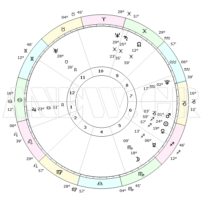 | | ΘΕΣΕΙΣ ΠΛΑΝΗΤΩΝ ΑΣΤΡΟΛΟΓΙΚΟΥ ΧΑΡΤΗ ΤΗΣ ΣΤΙΓΜΗΣ ΑΥΤΗΣ | | | | Πλανήτης | Ζώδιο | Μοίρες | Δεκαήμ. | Σε οίκο | Απόκλιση | | Ακμές των οίκων | | Ηλιος | Τοξότης | 24°39' | Τρίτο | 10 | 23 S 19 | | 1ος | 16°39' | Υδροχόος | | Σελήνη | Σκορπιός | 14°19' | Δεύτερο | 9 | 20 S 20 | | 2ος | 02°24' | Κριός | | Ερμής | Τοξότης | 05°47' | Πρώτο | 10 | 19 S 55 | | 3ος | 07°48' | Ταύρος | | Αφροδίτη | Τοξότης | 19°33' | Δεύτερο | 10 | 22 S 55 | | 4ος | 03°43' | Δίδυμοι | | Αρης | Αιγόκερως | 00°48' | Πρώτο | 11 | 24 S 13 | | 5ος | 25°38' | Δίδυμοι | | Δίας | Καρκίνος | 23°13'R | Τρίτο | 6 | 21 N 38 | | 6ος | 17°60' | Καρκίνος | | Κρόνος | Ιχθείς | 25°34' | Τρίτο | 1 | 03 S 53 | | 7ος | 16°39' | Λέων | | Ουρανός | Ταύρος | 28°27'R | Τρίτο | 3 | 19 N 37 | | 8ος | 02°24' | Ζυγός | | Ποσειδώνας | Ιχθείς | 29°23' | Τρίτο | 1 | 01 S 29 | | 9ος | 07°48' | Σκορπιός | | Πλούτωνας | Υδροχόος | 02°17' | Πρώτο | 12 | 23 S 19 | | 10ος | 03°43' | Τοξότης | | Β. Δεσμός | Ιχθείς | 12°60' | Δεύτερο | 1 | 06 S 41 | | 11ος | 25°38' | Τοξότης | | Ωροσκόπος | Υδροχόος | 16°39' | Δεύτερο | | | 12ος | 17°60' | Αιγόκερως | | Μεσουράνημα | Τοξότης | 03°43' | Πρώτο | | | |