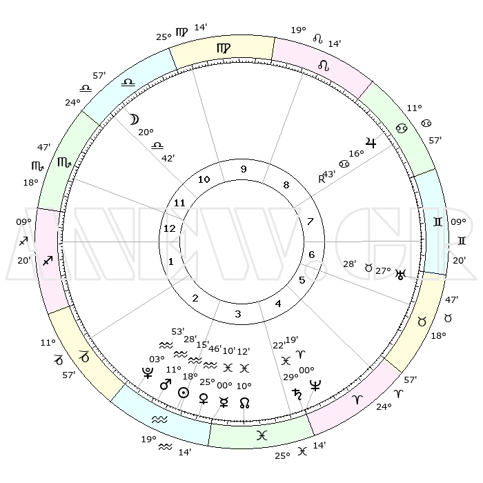 | | ΘΕΣΕΙΣ ΠΛΑΝΗΤΩΝ ΑΣΤΡΟΛΟΓΙΚΟΥ ΧΑΡΤΗ ΤΗΣ ΣΤΙΓΜΗΣ ΑΥΤΗΣ | | | | Πλανήτης | Ζώδιο | Μοίρες | Δεκαήμ. | Σε οίκο | Απόκλιση | | Ακμές των οίκων | | Ηλιος | Υδροχόος | 18°11' | Δεύτερο | 3 | 15 S 22 | | 1ος | 20°25' | Σκορπιός | | Σελήνη | Ζυγός | 19°55' | Δεύτερο | 11 | 10 S 58 | | 2ος | 20°24' | Τοξότης | | Ερμής | Ιχθείς | 00°04' | Πρώτο | 3 | 12 S 42 | | 3ος | 24°37' | Αιγόκερως | | Αφροδίτη | Υδροχόος | 25°41' | Τρίτο | 3 | 14 S 18 | | 4ος | 00°14' | Ιχθείς | | Αρης | Υδροχόος | 11°25' | Δεύτερο | 3 | 18 S 22 | | 5ος | 02°16' | Κριός | | Δίας | Καρκίνος | 16°44'R | Δεύτερο | 8 | 22 N 42 | | 6ος | 28°37' | Κριός | | Κρόνος | Ιχθείς | 29°22' | Τρίτο | 4 | 02 S 14 | | 7ος | 20°25' | Ταύρος | | Ουρανός | Ταύρος | 27°28' | Τρίτο | 7 | 19 N 24 | | 8ος | 20°24' | Δίδυμοι | | Ποσειδώνας | Κριός | 00°19' | Πρώτο | 4 | 01 S 05 | | 9ος | 24°37' | Καρκίνος | | Πλούτωνας | Υδροχόος | 03°53' | Πρώτο | 3 | 22 S 59 | | 10ος | 00°14' | Παρθένος | | Β. Δεσμός | Ιχθείς | 10°13' | Δεύτερο | 4 | 07 S 44 | | 11ος | 02°16' | Ζυγός | | Ωροσκόπος | Σκορπιός | 20°25' | Τρίτο | | | 12ος | 28°37' | Ζυγός | | Μεσουράνημα | Παρθένος | 00°14' | Πρώτο | | | |
