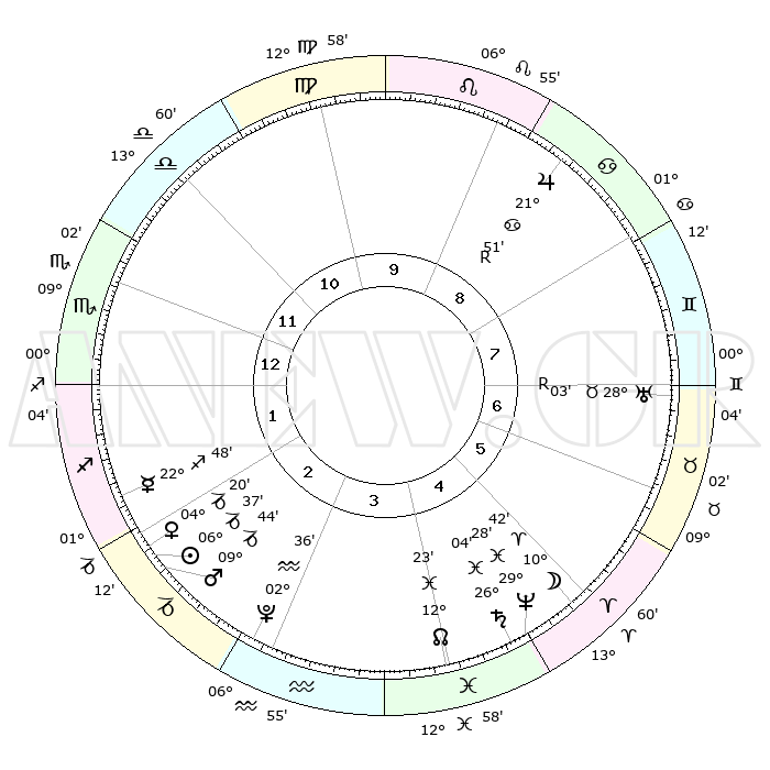 | | ΘΕΣΕΙΣ ΠΛΑΝΗΤΩΝ ΑΣΤΡΟΛΟΓΙΚΟΥ ΧΑΡΤΗ ΤΗΣ ΣΤΙΓΜΗΣ ΑΥΤΗΣ | | | | Πλανήτης | Ζώδιο | Μοίρες | Δεκαήμ. | Σε οίκο | Απόκλιση | | Ακμές των οίκων | | Ηλιος | Αιγόκερως | 06°32' | Πρώτο | 2 | 23 S 16 | | 1ος | 07°54' | Σκορπιός | | Σελήνη | Κριός | 09°39' | Πρώτο | 5 | 06 N 03 | | 2ος | 06°50' | Τοξότης | | Ερμής | Τοξότης | 22°41' | Τρίτο | 2 | 23 S 21 | | 3ος | 09°30' | Αιγόκερως | | Αφροδίτη | Αιγόκερως | 04°14' | Πρώτο | 2 | 23 S 43 | | 4ος | 14°15' | Υδροχόος | | Αρης | Αιγόκερως | 09°40' | Πρώτο | 3 | 23 S 57 | | 5ος | 17°00' | Ιχθείς | | Δίας | Καρκίνος | 21°52'R | Τρίτο | 9 | 21 N 53 | | 6ος | 14°53' | Κριός | | Κρόνος | Ιχθείς | 26°04' | Τρίτο | 5 | 03 S 39 | | 7ος | 07°54' | Ταύρος | | Ουρανός | Ταύρος | 28°03'R | Τρίτο | 7 | 19 N 32 | | 8ος | 06°50' | Δίδυμοι | | Ποσειδώνας | Ιχθείς | 29°28' | Τρίτο | 5 | 01 S 26 | | 9ος | 09°30' | Καρκίνος | | Πλούτωνας | Υδροχόος | 02°36' | Πρώτο | 3 | 23 S 15 | | 10ος | 14°15' | Λέων | | Β. Δεσμός | Ιχθείς | 12°23' | Δεύτερο | 4 | 06 S 55 | | 11ος | 17°00' | Παρθένος | | Ωροσκόπος | Σκορπιός | 07°54' | Πρώτο | | | 12ος | 14°53' | Ζυγός | | Μεσουράνημα | Λέων | 14°15' | Δεύτερο | | | |