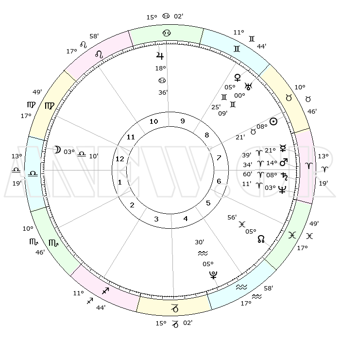 | | ΘΕΣΕΙΣ ΠΛΑΝΗΤΩΝ ΑΣΤΡΟΛΟΓΙΚΟΥ ΧΑΡΤΗ ΤΗΣ ΣΤΙΓΜΗΣ ΑΥΤΗΣ | | | | Πλανήτης | Ζώδιο | Μοίρες | Δεκαήμ. | Σε οίκο | Απόκλιση | | Ακμές των οίκων | | Ηλιος | Ταύρος | 08°17' | Πρώτο | 8 | 14 N 16 | | 1ος | 24°17' | Παρθένος | | Σελήνη | Ζυγός | 02°21' | Πρώτο | 1 | 02 S 55 | | 2ος | 20°26' | Ζυγός | | Ερμής | Κριός | 21°32' | Τρίτο | 8 | 06 N 23 | | 3ος | 20°38' | Σκορπιός | | Αφροδίτη | Δίδυμοι | 05°21' | Πρώτο | 9 | 21 N 58 | | 4ος | 23°34' | Τοξότης | | Αρης | Κριός | 14°31' | Δεύτερο | 7 | 04 N 53 | | 5ος | 26°39' | Αιγόκερως | | Δίας | Καρκίνος | 18°35' | Δεύτερο | 10 | 22 N 32 | | 6ος | 27°18' | Υδροχόος | | Κρόνος | Κριός | 08°59' | Πρώτο | 7 | 01 N 34 | | 7ος | 24°17' | Ιχθείς | | Ουρανός | Δίδυμοι | 00°09' | Πρώτο | 9 | 20 N 01 | | 8ος | 20°26' | Κριός | | Ποσειδώνας | Κριός | 03°11' | Πρώτο | 7 | 00 N 03 | | 9ος | 20°38' | Ταύρος | | Πλούτωνας | Υδροχόος | 05°30' | Πρώτο | 5 | 22 S 48 | | 10ος | 23°34' | Δίδυμοι | | Β. Δεσμός | Ιχθείς | 05°57' | Πρώτο | 6 | 09 S 20 | | 11ος | 26°39' | Καρκίνος | | Ωροσκόπος | Παρθένος | 24°17' | Τρίτο | | | 12ος | 27°18' | Λέων | | Μεσουράνημα | Δίδυμοι | 23°34' | Τρίτο | | | |