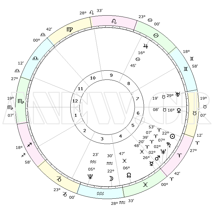 | | ΘΕΣΕΙΣ ΠΛΑΝΗΤΩΝ ΑΣΤΡΟΛΟΓΙΚΟΥ ΧΑΡΤΗ ΤΗΣ ΣΤΙΓΜΗΣ ΑΥΤΗΣ | | | | Πλανήτης | Ζώδιο | Μοίρες | Δεκαήμ. | Σε οίκο | Απόκλιση | | Ακμές των οίκων | | Ηλιος | Κριός | 22°49' | Τρίτο | 6 | 08 N 52 | | 1ος | 29°11' | Ζυγός | | Σελήνη | Υδροχόος | 21°37' | Τρίτο | 4 | 15 S 41 | | 2ος | 27°33' | Σκορπιός | | Ερμής | Ιχθείς | 26°42' | Τρίτο | 5 | 03 S 36 | | 3ος | 29°27' | Τοξότης | | Αφροδίτη | Ταύρος | 16°03' | Δεύτερο | 7 | 16 N 42 | | 4ος | 03°35' | Υδροχόος | | Αρης | Κριός | 02°16' | Πρώτο | 5 | 00 S 01 | | 5ος | 06°30' | Ιχθείς | | Δίας | Καρκίνος | 16°44' | Δεύτερο | 9 | 22 N 46 | | 6ος | 05°15' | Κριός | | Κρόνος | Κριός | 07°06' | Πρώτο | 6 | 00 N 51 | | 7ος | 29°11' | Κριός | | Ουρανός | Ταύρος | 29°19' | Τρίτο | 8 | 19 N 50 | | 8ος | 27°33' | Ταύρος | | Ποσειδώνας | Κριός | 02°39' | Πρώτο | 5 | 00 S 09 | | 9ος | 29°27' | Δίδυμοι | | Πλούτωνας | Υδροχόος | 05°23' | Πρώτο | 4 | 22 S 47 | | 10ος | 03°35' | Λέων | | Β. Δεσμός | Ιχθείς | 06°47' | Πρώτο | 5 | 09 S 01 | | 11ος | 06°30' | Παρθένος | | Ωροσκόπος | Ζυγός | 29°11' | Τρίτο | | | 12ος | 05°15' | Ζυγός | | Μεσουράνημα | Λέων | 03°35' | Πρώτο | | | |