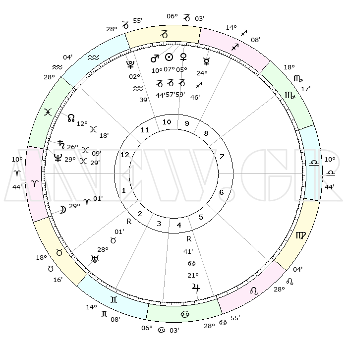 | | ΘΕΣΕΙΣ ΠΛΑΝΗΤΩΝ ΑΣΤΡΟΛΟΓΙΚΟΥ ΧΑΡΤΗ ΤΗΣ ΣΤΙΓΜΗΣ ΑΥΤΗΣ | | | | Πλανήτης | Ζώδιο | Μοίρες | Δεκαήμ. | Σε οίκο | Απόκλιση | | Ακμές των οίκων | | Ηλιος | Αιγόκερως | 07°53' | Πρώτο | 11 | 23 S 12 | | 1ος | 02°33' | Ιχθείς | | Σελήνη | Κριός | 28°05' | Τρίτο | 2 | 14 N 15 | | 2ος | 17°45' | Κριός | | Ερμής | Τοξότης | 24°40' | Τρίτο | 10 | 23 S 36 | | 3ος | 19°58' | Ταύρος | | Αφροδίτη | Αιγόκερως | 05°54' | Πρώτο | 11 | 23 S 42 | | 4ος | 14°07' | Δίδυμοι | | Αρης | Αιγόκερως | 10°41' | Δεύτερο | 11 | 23 S 53 | | 5ος | 05°48' | Καρκίνος | | Δίας | Καρκίνος | 21°42'R | Τρίτο | 5 | 21 N 55 | | 6ος | 29°38' | Καρκίνος | | Κρόνος | Ιχθείς | 26°08' | Τρίτο | 1 | 03 S 37 | | 7ος | 02°33' | Παρθένος | | Ουρανός | Ταύρος | 28°01'R | Τρίτο | 3 | 19 N 31 | | 8ος | 17°45' | Ζυγός | | Ποσειδώνας | Ιχθείς | 29°29' | Τρίτο | 1 | 01 S 26 | | 9ος | 19°58' | Σκορπιός | | Πλούτωνας | Υδροχόος | 02°39' | Πρώτο | 12 | 23 S 14 | | 10ος | 14°07' | Τοξότης | | Β. Δεσμός | Ιχθείς | 12°19' | Δεύτερο | 1 | 06 S 56 | | 11ος | 05°48' | Αιγόκερως | | Ωροσκόπος | Ιχθείς | 02°33' | Πρώτο | | | 12ος | 29°38' | Αιγόκερως | | Μεσουράνημα | Τοξότης | 14°07' | Δεύτερο | | | |