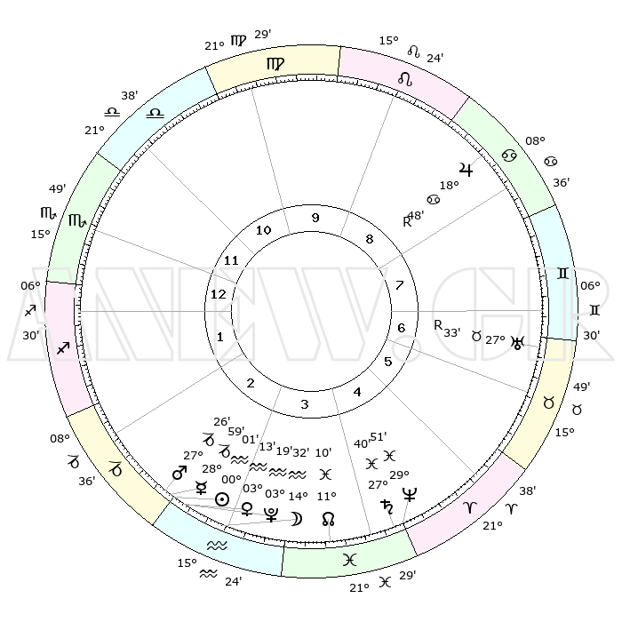 | | ΘΕΣΕΙΣ ΠΛΑΝΗΤΩΝ ΑΣΤΡΟΛΟΓΙΚΟΥ ΧΑΡΤΗ ΤΗΣ ΣΤΙΓΜΗΣ ΑΥΤΗΣ | | | | Πλανήτης | Ζώδιο | Μοίρες | Δεκαήμ. | Σε οίκο | Απόκλιση | | Ακμές των οίκων | | Ηλιος | Αιγόκερως | 29°55' | Τρίτο | 3 | 20 S 10 | | 1ος | 11°01' | Σκορπιός | | Σελήνη | Υδροχόος | 13°26' | Δεύτερο | 3 | 18 S 58 | | 2ος | 10°10' | Τοξότης | | Ερμής | Αιγόκερως | 28°50' | Τρίτο | 3 | 22 S 21 | | 3ος | 13°10' | Αιγόκερως | | Αφροδίτη | Υδροχόος | 03°06' | Πρώτο | 3 | 20 S 33 | | 4ος | 18°09' | Υδροχόος | | Αρης | Αιγόκερως | 27°22' | Τρίτο | 3 | 21 S 39 | | 5ος | 20°47' | Ιχθείς | | Δίας | Καρκίνος | 18°49'R | Δεύτερο | 9 | 22 N 23 | | 6ος | 18°18' | Κριός | | Κρόνος | Ιχθείς | 27°39' | Τρίτο | 5 | 02 S 57 | | 7ος | 11°01' | Ταύρος | | Ουρανός | Ταύρος | 27°33'R | Τρίτο | 7 | 19 N 25 | | 8ος | 10°10' | Δίδυμοι | | Ποσειδώνας | Ιχθείς | 29°51' | Τρίτο | 5 | 01 S 17 | | 9ος | 13°10' | Καρκίνος | | Πλούτωνας | Υδροχόος | 03°19' | Πρώτο | 3 | 23 S 06 | | 10ος | 18°09' | Λέων | | Β. Δεσμός | Ιχθείς | 11°10' | Δεύτερο | 4 | 07 S 23 | | 11ος | 20°47' | Παρθένος | | Ωροσκόπος | Σκορπιός | 11°01' | Δεύτερο | | | 12ος | 18°18' | Ζυγός | | Μεσουράνημα | Λέων | 18°09' | Δεύτερο | | | |