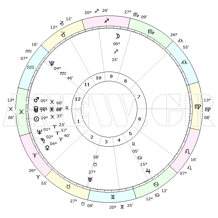 | | ΘΕΣΕΙΣ ΠΛΑΝΗΤΩΝ ΑΣΤΡΟΛΟΓΙΚΟΥ ΧΑΡΤΗ ΤΗΣ ΣΤΙΓΜΗΣ ΑΥΤΗΣ | | | | Πλανήτης | Ζώδιο | Μοίρες | Δεκαήμ. | Σε οίκο | Απόκλιση | | Ακμές των οίκων | | Ηλιος | Ιχθείς | 19°33' | Δεύτερο | 1 | 04 S 08 | | 1ος | 10°45' | Υδροχόος | | Σελήνη | Τοξότης | 05°41' | Πρώτο | 10 | 26 S 26 | | 2ος | 26°11' | Ιχθείς | | Ερμής | Ιχθείς | 14°12'R | Δεύτερο | 1 | 03 S 06 | | 3ος | 02°43' | Ταύρος | | Αφροδίτη | Κριός | 04°35' | Πρώτο | 2 | 00 N 44 | | 4ος | 29°28' | Ταύρος | | Αρης | Ιχθείς | 05°57' | Πρώτο | 1 | 10 S 21 | | 5ος | 21°36' | Δίδυμοι | | Δίας | Καρκίνος | 15°05'R | Δεύτερο | 6 | 22 N 56 | | 6ος | 13°33' | Καρκίνος | | Κρόνος | Κριός | 02°57' | Πρώτο | 2 | 00 S 47 | | 7ος | 10°45' | Λέων | | Ουρανός | Ταύρος | 27°58' | Τρίτο | 3 | 19 N 32 | | 8ος | 26°11' | Παρθένος | | Ποσειδώνας | Κριός | 01°23' | Πρώτο | 2 | 00 S 39 | | 9ος | 02°43' | Σκορπιός | | Πλούτωνας | Υδροχόος | 04°46' | Πρώτο | 12 | 22 S 50 | | 10ος | 29°28' | Σκορπιός | | Β. Δεσμός | Ιχθείς | 08°34' | Πρώτο | 1 | 08 S 21 | | 11ος | 21°36' | Τοξότης | | Ωροσκόπος | Υδροχόος | 10°45' | Δεύτερο | | | 12ος | 13°33' | Αιγόκερως | | Μεσουράνημα | Σκορπιός | 29°28' | Τρίτο | | | |