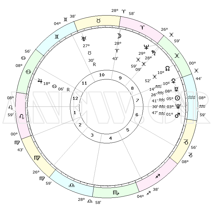 | | ΘΕΣΕΙΣ ΠΛΑΝΗΤΩΝ ΑΣΤΡΟΛΟΓΙΚΟΥ ΧΑΡΤΗ ΤΗΣ ΣΤΙΓΜΗΣ ΑΥΤΗΣ | | | | Πλανήτης | Ζώδιο | Μοίρες | Δεκαήμ. | Σε οίκο | Απόκλιση | | Ακμές των οίκων | | Ηλιος | Υδροχόος | 05°38' | Πρώτο | 7 | 18 S 52 | | 1ος | 21°17' | Καρκίνος | | Σελήνη | Κριός | 27°52' | Τρίτο | 10 | 14 N 21 | | 2ος | 11°52' | Λέων | | Ερμής | Υδροχόος | 08°19' | Πρώτο | 7 | 20 S 12 | | 3ος | 05°46' | Παρθένος | | Αφροδίτη | Υδροχόος | 10°09' | Δεύτερο | 7 | 18 S 54 | | 4ος | 05°35' | Ζυγός | | Αρης | Υδροχόος | 01°44' | Πρώτο | 7 | 20 S 46 | | 5ος | 11°37' | Σκορπιός | | Δίας | Καρκίνος | 18°06'R | Δεύτερο | 12 | 22 N 30 | | 6ος | 18°47' | Τοξότης | | Κρόνος | Ιχθείς | 28°09' | Τρίτο | 9 | 02 S 45 | | 7ος | 21°17' | Αιγόκερως | | Ουρανός | Ταύρος | 27°30'R | Τρίτο | 11 | 19 N 25 | | 8ος | 11°52' | Υδροχόος | | Ποσειδώνας | Ιχθείς | 29°59' | Τρίτο | 9 | 01 S 13 | | 9ος | 05°46' | Ιχθείς | | Πλούτωνας | Υδροχόος | 03°30' | Πρώτο | 7 | 23 S 04 | | 10ος | 05°35' | Κριός | | Β. Δεσμός | Ιχθείς | 10°52' | Δεύτερο | 9 | 07 S 29 | | 11ος | 11°37' | Ταύρος | | Ωροσκόπος | Καρκίνος | 21°17' | Τρίτο | | | 12ος | 18°47' | Δίδυμοι | | Μεσουράνημα | Κριός | 05°35' | Πρώτο | | | |