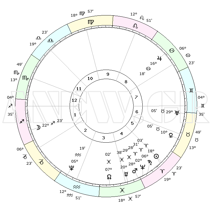 | | ΘΕΣΕΙΣ ΠΛΑΝΗΤΩΝ ΑΣΤΡΟΛΟΓΙΚΟΥ ΧΑΡΤΗ ΤΗΣ ΣΤΙΓΜΗΣ ΑΥΤΗΣ | | | | Πλανήτης | Ζώδιο | Μοίρες | Δεκαήμ. | Σε οίκο | Απόκλιση | | Ακμές των οίκων | | Ηλιος | Κριός | 17°59' | Δεύτερο | 5 | 07 N 03 | | 1ος | 16°34' | Σκορπιός | | Σελήνη | Τοξότης | 21°39' | Τρίτο | 2 | 28 S 11 | | 2ος | 16°11' | Τοξότης | | Ερμής | Ιχθείς | 20°34' | Τρίτο | 4 | 05 S 43 | | 3ος | 19°53' | Αιγόκερως | | Αφροδίτη | Ταύρος | 10°01' | Δεύτερο | 6 | 14 N 40 | | 4ος | 25°16' | Υδροχόος | | Αρης | Ιχθείς | 28°26' | Τρίτο | 5 | 01 S 33 | | 5ος | 27°35' | Ιχθείς | | Δίας | Καρκίνος | 16°17' | Δεύτερο | 8 | 22 N 49 | | 6ος | 24°25' | Κριός | | Κρόνος | Κριός | 06°30' | Πρώτο | 5 | 00 N 37 | | 7ος | 16°34' | Ταύρος | | Ουρανός | Ταύρος | 29°04' | Τρίτο | 7 | 19 N 47 | | 8ος | 16°11' | Δίδυμοι | | Ποσειδώνας | Κριός | 02°28' | Πρώτο | 5 | 00 S 13 | | 9ος | 19°53' | Καρκίνος | | Πλούτωνας | Υδροχόος | 05°19' | Πρώτο | 3 | 22 S 47 | | 10ος | 25°16' | Λέων | | Β. Δεσμός | Ιχθείς | 07°03' | Πρώτο | 4 | 08 S 55 | | 11ος | 27°35' | Παρθένος | | Ωροσκόπος | Σκορπιός | 16°34' | Δεύτερο | | | 12ος | 24°25' | Ζυγός | | Μεσουράνημα | Λέων | 25°16' | Τρίτο | | | |