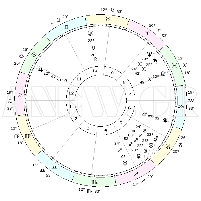 | | ΘΕΣΕΙΣ ΠΛΑΝΗΤΩΝ ΑΣΤΡΟΛΟΓΙΚΟΥ ΧΑΡΤΗ ΤΗΣ ΣΤΙΓΜΗΣ ΑΥΤΗΣ | | | | Πλανήτης | Ζώδιο | Μοίρες | Δεκαήμ. | Σε οίκο | Απόκλιση | | Ακμές των οίκων | | Ηλιος | Τοξότης | 28°04' | Τρίτο | 5 | 23 S 25 | | 1ος | 00°12' | Λέων | | Σελήνη | Τοξότης | 24°20' | Τρίτο | 5 | 28 S 12 | | 2ος | 21°15' | Λέων | | Ερμής | Τοξότης | 10°29' | Δεύτερο | 5 | 21 S 06 | | 3ος | 16°20' | Παρθένος | | Αφροδίτη | Τοξότης | 23°47' | Τρίτο | 5 | 23 S 19 | | 4ος | 17°23' | Ζυγός | | Αρης | Αιγόκερως | 03°21' | Πρώτο | 6 | 24 S 12 | | 5ος | 23°26' | Σκορπιός | | Δίας | Καρκίνος | 22°51'R | Τρίτο | 12 | 21 N 42 | | 6ος | 29°06' | Τοξότης | | Κρόνος | Ιχθείς | 25°42' | Τρίτο | 9 | 03 S 49 | | 7ος | 00°12' | Υδροχόος | | Ουρανός | Ταύρος | 28°20'R | Τρίτο | 11 | 19 N 35 | | 8ος | 21°15' | Υδροχόος | | Ποσειδώνας | Ιχθείς | 29°24' | Τρίτο | 9 | 01 S 28 | | 9ος | 16°20' | Ιχθείς | | Πλούτωνας | Υδροχόος | 02°22' | Πρώτο | 7 | 23 S 18 | | 10ος | 17°23' | Κριός | | Β. Δεσμός | Ιχθείς | 12°49' | Δεύτερο | 8 | 06 S 45 | | 11ος | 23°26' | Ταύρος | | Ωροσκόπος | Λέων | 00°12' | Πρώτο | | | 12ος | 29°06' | Δίδυμοι | | Μεσουράνημα | Κριός | 17°23' | Δεύτερο | | | |