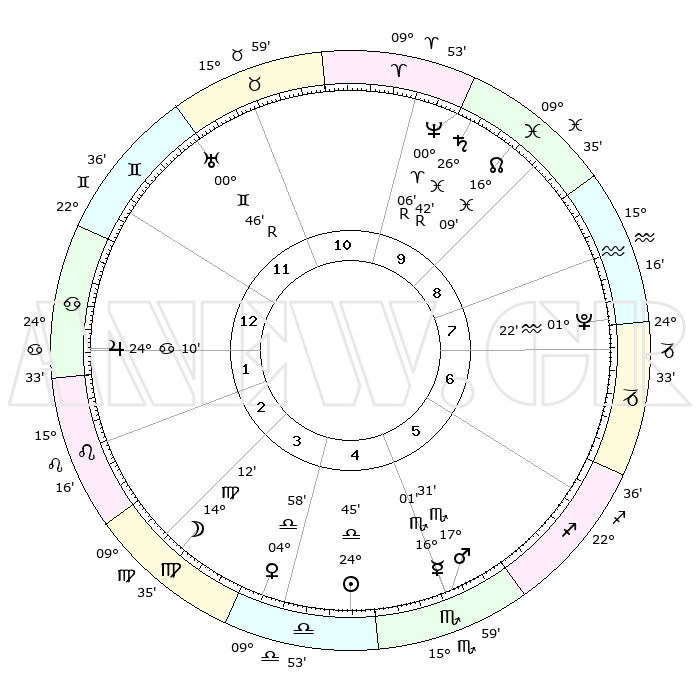 | ΘΕΣΕΙΣ ΠΛΑΝΗΤΩΝ ΑΣΤΡΟΛΟΓΙΚΟΥ ΧΑΡΤΗ ΤΗΣ ΣΤΙΓΜΗΣ ΑΥΤΗΣ | | Πλανήτης | Ζώδιο | Μοίρες | Δεκαήμ. | Σε οίκο | Απόκλιση | | Ακμές των οίκων | Ηλιος | Ζυγός | 23°54' | Τρίτο | 2 | 09 S 16 | | 1ος | 06°10' | Παρθένος | Σελήνη | Παρθένος | 03°30' | Πρώτο | 12 | 11 N 26 | | 2ος | 00°40' | Ζυγός | Ερμής | Σκορπιός | 14°52' | Δεύτερο | 3 | 18 S 09 | | 3ος | 29°51' | Ζυγός | Αφροδίτη | Ζυγός | 03°55' | Πρώτο | 2 | 00 S 09 | | 4ος | 02°48' | Τοξότης | Αρης | Σκορπιός | 16°55' | Δεύτερο | 3 | 17 S 07 | | 5ος | 06°36' | Αιγόκερως | Δίας | Καρκίνος | 24°06' | Τρίτο | 11 | 21 N 20 | | 6ος | 08°07' | Υδροχόος | Κρόνος | Ιχθείς | 26°45'R | Τρίτο | 7 | 03 S 35 | | 7ος | 06°10' | Ιχθείς | Ουρανός | Δίδυμοι | 00°48'R | Πρώτο | 9 | 20 N 06 | | 8ος | 00°40' | Κριός | Ποσειδώνας | Κριός | 00°08'R | Πρώτο | 7 | 01 S 13 | | 9ος | 29°51' | Κριός | Πλούτωνας | Υδροχόος | 01°22' | Πρώτο | 5 | 23 S 32 | | 10ος | 02°48' | Δίδυμοι | Β. Δεσμός | Ιχθείς | 16°12' | Δεύτερο | 7 | 05 S 27 | | 11ος | 06°36' | Καρκίνος | Ωροσκόπος | Παρθένος | 06°10' | Πρώτο | | | 12ος | 08°07' | Λέων | Μεσουράνημα | Δίδυμοι | 02°48' | Πρώτο | | | |