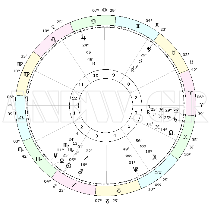 | | ΘΕΣΕΙΣ ΠΛΑΝΗΤΩΝ ΑΣΤΡΟΛΟΓΙΚΟΥ ΧΑΡΤΗ ΤΗΣ ΣΤΙΓΜΗΣ ΑΥΤΗΣ | | | | Πλανήτης | Ζώδιο | Μοίρες | Δεκαήμ. | Σε οίκο | Απόκλιση | | Ακμές των οίκων | | Ηλιος | Τοξότης | 04°59' | Πρώτο | 3 | 21 S 07 | | 1ος | 29°17' | Παρθένος | | Σελήνη | Υδροχόος | 19°37' | Δεύτερο | 5 | 16 S 56 | | 2ος | 25°49' | Ζυγός | | Ερμής | Σκορπιός | 21°24'R | Τρίτο | 2 | 15 S 56 | | 3ος | 26°13' | Σκορπιός | | Αφροδίτη | Σκορπιός | 25°11' | Τρίτο | 2 | 18 S 14 | | 4ος | 29°12' | Τοξότης | | Αρης | Τοξότης | 16°21' | Δεύτερο | 3 | 23 S 22 | | 5ος | 02°11' | Υδροχόος | | Δίας | Καρκίνος | 24°46'R | Τρίτο | 10 | 21 N 19 | | 6ος | 02°39' | Ιχθείς | | Κρόνος | Ιχθείς | 25°17'R | Τρίτο | 6 | 04 S 04 | | 7ος | 29°17' | Ιχθείς | | Ουρανός | Ταύρος | 29°13'R | Τρίτο | 9 | 19 N 46 | | 8ος | 25°49' | Κριός | | Ποσειδώνας | Ιχθείς | 29°25'R | Τρίτο | 7 | 01 S 28 | | 9ος | 26°13' | Ταύρος | | Πλούτωνας | Υδροχόος | 01°49' | Πρώτο | 4 | 23 S 25 | | 10ος | 29°12' | Δίδυμοι | | Β. Δεσμός | Ιχθείς | 14°01' | Δεύτερο | 6 | 06 S 17 | | 11ος | 02°11' | Λέων | | Ωροσκόπος | Παρθένος | 29°17' | Τρίτο | | | 12ος | 02°39' | Παρθένος | | Μεσουράνημα | Δίδυμοι | 29°12' | Τρίτο | | | |