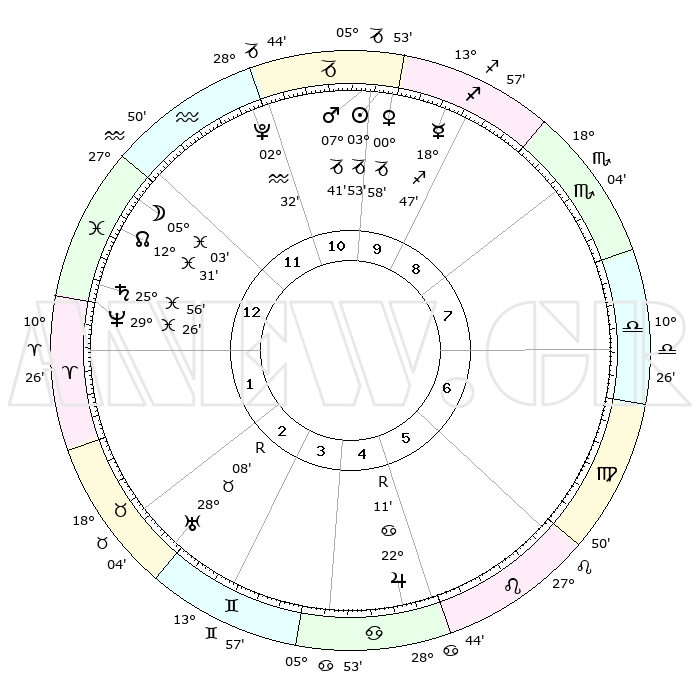 | | ΘΕΣΕΙΣ ΠΛΑΝΗΤΩΝ ΑΣΤΡΟΛΟΓΙΚΟΥ ΧΑΡΤΗ ΤΗΣ ΣΤΙΓΜΗΣ ΑΥΤΗΣ | | | | Πλανήτης | Ζώδιο | Μοίρες | Δεκαήμ. | Σε οίκο | Απόκλιση | | Ακμές των οίκων | | Ηλιος | Αιγόκερως | 03°49' | Πρώτο | 10 | 23 S 23 | | 1ος | 00°01' | Ιχθείς | | Σελήνη | Ιχθείς | 04°09' | Πρώτο | 1 | 10 S 34 | | 2ος | 15°26' | Κριός | | Ερμής | Τοξότης | 18°41' | Δεύτερο | 10 | 22 S 44 | | 3ος | 18°09' | Ταύρος | | Αφροδίτη | Αιγόκερως | 00°53' | Πρώτο | 10 | 23 S 41 | | 4ος | 12°33' | Δίδυμοι | | Αρης | Αιγόκερως | 07°38' | Πρώτο | 11 | 24 S 04 | | 5ος | 04°14' | Καρκίνος | | Δίας | Καρκίνος | 22°12'R | Τρίτο | 5 | 21 N 50 | | 6ος | 27°48' | Καρκίνος | | Κρόνος | Ιχθείς | 25°56' | Τρίτο | 1 | 03 S 43 | | 7ος | 00°01' | Παρθένος | | Ουρανός | Ταύρος | 28°08'R | Τρίτο | 3 | 19 N 33 | | 8ος | 15°26' | Ζυγός | | Ποσειδώνας | Ιχθείς | 29°26' | Τρίτο | 1 | 01 S 27 | | 9ος | 18°09' | Σκορπιός | | Πλούτωνας | Υδροχόος | 02°32' | Πρώτο | 12 | 23 S 16 | | 10ος | 12°33' | Τοξότης | | Β. Δεσμός | Ιχθείς | 12°31' | Δεύτερο | 1 | 06 S 52 | | 11ος | 04°14' | Αιγόκερως | | Ωροσκόπος | Ιχθείς | 00°01' | Πρώτο | | | 12ος | 27°48' | Αιγόκερως | | Μεσουράνημα | Τοξότης | 12°33' | Δεύτερο | | | |