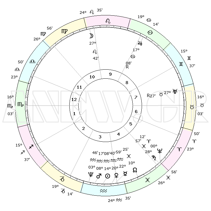 | | ΘΕΣΕΙΣ ΠΛΑΝΗΤΩΝ ΑΣΤΡΟΛΟΓΙΚΟΥ ΧΑΡΤΗ ΤΗΣ ΣΤΙΓΜΗΣ ΑΥΤΗΣ | | | | Πλανήτης | Ζώδιο | Μοίρες | Δεκαήμ. | Σε οίκο | Απόκλιση | | Ακμές των οίκων | | Ηλιος | Υδροχόος | 14°05' | Δεύτερο | 4 | 16 S 36 | | 1ος | 00°33' | Σκορπιός | | Σελήνη | Λέων | 26°58' | Τρίτο | 10 | 13 N 33 | | 2ος | 28°59' | Σκορπιός | | Ερμής | Υδροχόος | 22°53' | Τρίτο | 4 | 15 S 32 | | 3ος | 00°59' | Αιγόκερως | | Αφροδίτη | Υδροχόος | 20°36' | Τρίτο | 4 | 15 S 56 | | 4ος | 05°13' | Υδροχόος | | Αρης | Υδροχόος | 08°14' | Πρώτο | 4 | 19 S 13 | | 5ος | 08°07' | Ιχθείς | | Δίας | Καρκίνος | 17°09'R | Δεύτερο | 9 | 22 N 38 | | 6ος | 06°45' | Κριός | | Κρόνος | Ιχθείς | 28°57' | Τρίτο | 5 | 02 S 25 | | 7ος | 00°33' | Ταύρος | | Ουρανός | Ταύρος | 27°27'R | Τρίτο | 7 | 19 N 24 | | 8ος | 28°59' | Ταύρος | | Ποσειδώνας | Κριός | 00°12' | Πρώτο | 5 | 01 S 08 | | 9ος | 00°59' | Καρκίνος | | Πλούτωνας | Υδροχόος | 03°46' | Πρώτο | 3 | 23 S 01 | | 10ος | 05°13' | Λέων | | Β. Δεσμός | Ιχθείς | 10°26' | Δεύτερο | 5 | 07 S 39 | | 11ος | 08°07' | Παρθένος | | Ωροσκόπος | Σκορπιός | 00°33' | Πρώτο | | | 12ος | 06°45' | Ζυγός | | Μεσουράνημα | Λέων | 05°13' | Πρώτο | | | |