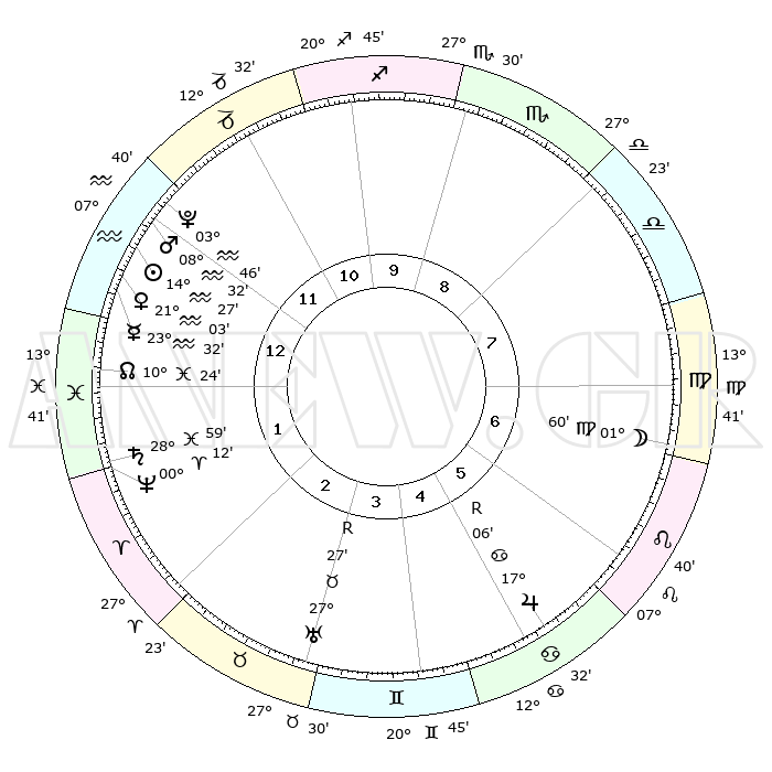 | | ΘΕΣΕΙΣ ΠΛΑΝΗΤΩΝ ΑΣΤΡΟΛΟΓΙΚΟΥ ΧΑΡΤΗ ΤΗΣ ΣΤΙΓΜΗΣ ΑΥΤΗΣ | | | | Πλανήτης | Ζώδιο | Μοίρες | Δεκαήμ. | Σε οίκο | Απόκλιση | | Ακμές των οίκων | | Ηλιος | Υδροχόος | 14°23' | Δεύτερο | 1 | 16 S 31 | | 1ος | 07°59' | Υδροχόος | | Σελήνη | Παρθένος | 01°03' | Πρώτο | 7 | 11 N 47 | | 2ος | 23°09' | Ιχθείς | | Ερμής | Υδροχόος | 23°25' | Τρίτο | 1 | 15 S 20 | | 3ος | 00°14' | Ταύρος | | Αφροδίτη | Υδροχόος | 20°58' | Τρίτο | 1 | 15 S 49 | | 4ος | 27°23' | Ταύρος | | Αρης | Υδροχόος | 08°28' | Πρώτο | 1 | 19 S 09 | | 5ος | 19°39' | Δίδυμοι | | Δίας | Καρκίνος | 17°07'R | Δεύτερο | 6 | 22 N 39 | | 6ος | 11°26' | Καρκίνος | | Κρόνος | Ιχθείς | 28°59' | Τρίτο | 2 | 02 S 24 | | 7ος | 07°59' | Λέων | | Ουρανός | Ταύρος | 27°27'R | Τρίτο | 4 | 19 N 24 | | 8ος | 23°09' | Παρθένος | | Ποσειδώνας | Κριός | 00°12' | Πρώτο | 2 | 01 S 07 | | 9ος | 00°14' | Σκορπιός | | Πλούτωνας | Υδροχόος | 03°46' | Πρώτο | 12 | 23 S 00 | | 10ος | 27°23' | Σκορπιός | | Β. Δεσμός | Ιχθείς | 10°25' | Δεύτερο | 1 | 07 S 40 | | 11ος | 19°39' | Τοξότης | | Ωροσκόπος | Υδροχόος | 07°59' | Πρώτο | | | 12ος | 11°26' | Αιγόκερως | | Μεσουράνημα | Σκορπιός | 27°23' | Τρίτο | | | |