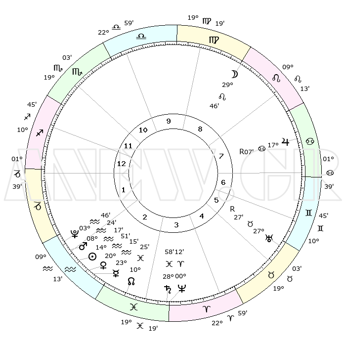 | | ΘΕΣΕΙΣ ΠΛΑΝΗΤΩΝ ΑΣΤΡΟΛΟΓΙΚΟΥ ΧΑΡΤΗ ΤΗΣ ΣΤΙΓΜΗΣ ΑΥΤΗΣ | | | | Πλανήτης | Ζώδιο | Μοίρες | Δεκαήμ. | Σε οίκο | Απόκλιση | | Ακμές των οίκων | | Ηλιος | Υδροχόος | 14°13' | Δεύτερο | 2 | 16 S 34 | | 1ος | 10°26' | Τοξότης | | Σελήνη | Λέων | 28°51' | Τρίτο | 9 | 12 N 45 | | 2ος | 13°15' | Αιγόκερως | | Ερμής | Υδροχόος | 23°08' | Τρίτο | 3 | 15 S 27 | | 3ος | 20°42' | Υδροχόος | | Αφροδίτη | Υδροχόος | 20°46' | Τρίτο | 3 | 15 S 53 | | 4ος | 26°41' | Ιχθείς | | Αρης | Υδροχόος | 08°21' | Πρώτο | 2 | 19 S 11 | | 5ος | 26°13' | Κριός | | Δίας | Καρκίνος | 17°08'R | Δεύτερο | 8 | 22 N 38 | | 6ος | 19°55' | Ταύρος | | Κρόνος | Ιχθείς | 28°58' | Τρίτο | 4 | 02 S 24 | | 7ος | 10°26' | Δίδυμοι | | Ουρανός | Ταύρος | 27°27'R | Τρίτο | 6 | 19 N 24 | | 8ος | 13°15' | Καρκίνος | | Ποσειδώνας | Κριός | 00°12' | Πρώτο | 4 | 01 S 08 | | 9ος | 20°42' | Λέων | | Πλούτωνας | Υδροχόος | 03°46' | Πρώτο | 2 | 23 S 01 | | 10ος | 26°41' | Παρθένος | | Β. Δεσμός | Ιχθείς | 10°25' | Δεύτερο | 3 | 07 S 40 | | 11ος | 26°13' | Ζυγός | | Ωροσκόπος | Τοξότης | 10°26' | Δεύτερο | | | 12ος | 19°55' | Σκορπιός | | Μεσουράνημα | Παρθένος | 26°41' | Τρίτο | | | |