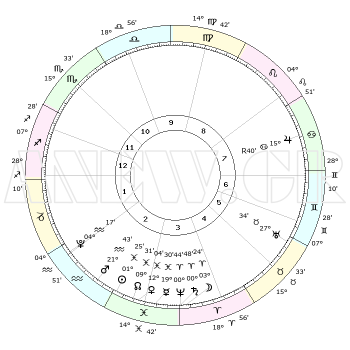 | | ΘΕΣΕΙΣ ΠΛΑΝΗΤΩΝ ΑΣΤΡΟΛΟΓΙΚΟΥ ΧΑΡΤΗ ΤΗΣ ΣΤΙΓΜΗΣ ΑΥΤΗΣ | | | | Πλανήτης | Ζώδιο | Μοίρες | Δεκαήμ. | Σε οίκο | Απόκλιση | | Ακμές των οίκων | | Ηλιος | Ιχθείς | 01°21' | Πρώτο | 3 | 11 S 00 | | 1ος | 04°37' | Τοξότης | | Σελήνη | Κριός | 02°21' | Πρώτο | 4 | 02 N 52 | | 2ος | 06°26' | Αιγόκερως | | Ερμής | Ιχθείς | 19°25' | Δεύτερο | 4 | 03 S 02 | | 3ος | 12°55' | Υδροχόος | | Αφροδίτη | Ιχθείς | 11°59' | Δεύτερο | 3 | 08 S 25 | | 4ος | 19°00' | Ιχθείς | | Αρης | Υδροχόος | 21°39' | Τρίτο | 3 | 15 S 19 | | 5ος | 19°26' | Κριός | | Δίας | Καρκίνος | 15°41'R | Δεύτερο | 8 | 22 N 51 | | 6ος | 13°51' | Ταύρος | | Κρόνος | Κριός | 00°47' | Πρώτο | 4 | 01 S 39 | | 7ος | 04°37' | Δίδυμοι | | Ουρανός | Ταύρος | 27°34' | Τρίτο | 6 | 19 N 26 | | 8ος | 06°26' | Καρκίνος | | Ποσειδώνας | Κριός | 00°44' | Πρώτο | 4 | 00 S 55 | | 9ος | 12°55' | Λέων | | Πλούτωνας | Υδροχόος | 04°17' | Πρώτο | 2 | 22 S 55 | | 10ος | 19°00' | Παρθένος | | Β. Δεσμός | Ιχθείς | 09°31' | Πρώτο | 3 | 08 S 00 | | 11ος | 19°26' | Ζυγός | | Ωροσκόπος | Τοξότης | 04°37' | Πρώτο | | | 12ος | 13°51' | Σκορπιός | | Μεσουράνημα | Παρθένος | 19°00' | Δεύτερο | | | |