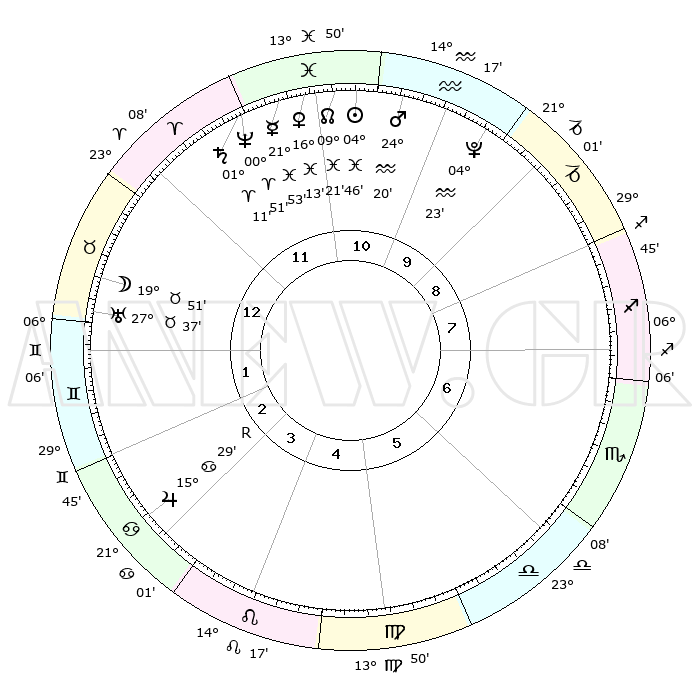 | | ΘΕΣΕΙΣ ΠΛΑΝΗΤΩΝ ΑΣΤΡΟΛΟΓΙΚΟΥ ΧΑΡΤΗ ΤΗΣ ΣΤΙΓΜΗΣ ΑΥΤΗΣ | | | | Πλανήτης | Ζώδιο | Μοίρες | Δεκαήμ. | Σε οίκο | Απόκλιση | | Ακμές των οίκων | | Ηλιος | Ιχθείς | 04°42' | Πρώτο | 11 | 09 S 47 | | 1ος | 04°47' | Ταύρος | | Σελήνη | Ταύρος | 18°53' | Δεύτερο | 1 | 22 N 12 | | 2ος | 05°41' | Δίδυμοι | | Ερμής | Ιχθείς | 21°51' | Τρίτο | 12 | 01 S 18 | | 3ος | 28°47' | Δίδυμοι | | Αφροδίτη | Ιχθείς | 16°08' | Δεύτερο | 11 | 06 S 47 | | 4ος | 20°30' | Καρκίνος | | Αρης | Υδροχόος | 24°17' | Τρίτο | 11 | 14 S 27 | | 5ος | 15°24' | Λέων | | Δίας | Καρκίνος | 15°30'R | Δεύτερο | 3 | 22 N 52 | | 6ος | 19°04' | Παρθένος | | Κρόνος | Κριός | 01°10' | Πρώτο | 12 | 01 S 30 | | 7ος | 04°47' | Σκορπιός | | Ουρανός | Ταύρος | 27°37' | Τρίτο | 1 | 19 N 27 | | 8ος | 05°41' | Τοξότης | | Ποσειδώνας | Κριός | 00°51' | Πρώτο | 12 | 00 S 52 | | 9ος | 28°47' | Τοξότης | | Πλούτωνας | Υδροχόος | 04°23' | Πρώτο | 10 | 22 S 54 | | 10ος | 20°30' | Αιγόκερως | | Β. Δεσμός | Ιχθείς | 09°21' | Πρώτο | 11 | 08 S 04 | | 11ος | 15°24' | Υδροχόος | | Ωροσκόπος | Ταύρος | 04°47' | Πρώτο | | | 12ος | 19°04' | Ιχθείς | | Μεσουράνημα | Αιγόκερως | 20°30' | Τρίτο | | | |