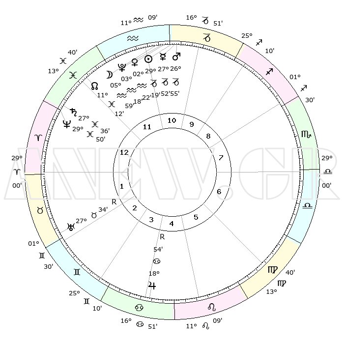 | | ΘΕΣΕΙΣ ΠΛΑΝΗΤΩΝ ΑΣΤΡΟΛΟΓΙΚΟΥ ΧΑΡΤΗ ΤΗΣ ΣΤΙΓΜΗΣ ΑΥΤΗΣ | | | | Πλανήτης | Ζώδιο | Μοίρες | Δεκαήμ. | Σε οίκο | Απόκλιση | | Ακμές των οίκων | | Ηλιος | Αιγόκερως | 29°15' | Τρίτο | 11 | 20 S 18 | | 1ος | 19°19' | Ιχθείς | | Σελήνη | Υδροχόος | 05°07' | Πρώτο | 11 | 21 S 49 | | 2ος | 01°59' | Ταύρος | | Ερμής | Αιγόκερως | 27°45' | Τρίτο | 11 | 22 S 33 | | 3ος | 01°07' | Δίδυμοι | | Αφροδίτη | Υδροχόος | 02°17' | Πρώτο | 11 | 20 S 43 | | 4ος | 23°59' | Δίδυμοι | | Αρης | Αιγόκερως | 26°51' | Τρίτο | 11 | 21 S 45 | | 5ος | 15°54' | Καρκίνος | | Δίας | Καρκίνος | 18°54'R | Δεύτερο | 5 | 22 N 23 | | 6ος | 11°46' | Λέων | | Κρόνος | Ιχθείς | 27°36' | Τρίτο | 1 | 02 S 59 | | 7ος | 19°19' | Παρθένος | | Ουρανός | Ταύρος | 27°34'R | Τρίτο | 2 | 19 N 25 | | 8ος | 01°59' | Σκορπιός | | Ποσειδώνας | Ιχθείς | 29°50' | Τρίτο | 1 | 01 S 17 | | 9ος | 01°07' | Τοξότης | | Πλούτωνας | Υδροχόος | 03°18' | Πρώτο | 11 | 23 S 06 | | 10ος | 23°59' | Τοξότης | | Β. Δεσμός | Ιχθείς | 11°12' | Δεύτερο | 12 | 07 S 22 | | 11ος | 15°54' | Αιγόκερως | | Ωροσκόπος | Ιχθείς | 19°19' | Δεύτερο | | | 12ος | 11°46' | Υδροχόος | | Μεσουράνημα | Τοξότης | 23°59' | Τρίτο | | | |