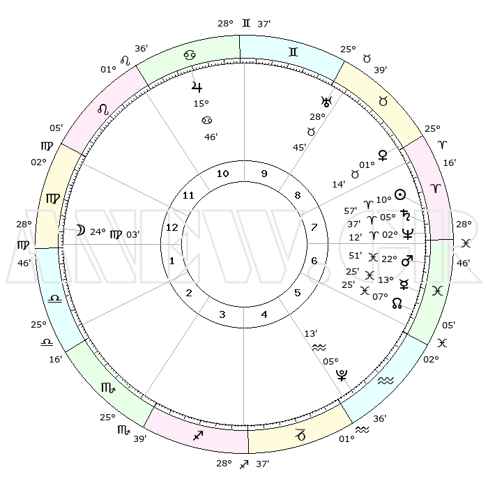 | | ΘΕΣΕΙΣ ΠΛΑΝΗΤΩΝ ΑΣΤΡΟΛΟΓΙΚΟΥ ΧΑΡΤΗ ΤΗΣ ΣΤΙΓΜΗΣ ΑΥΤΗΣ | | | | Πλανήτης | Ζώδιο | Μοίρες | Δεκαήμ. | Σε οίκο | Απόκλιση | | Ακμές των οίκων | | Ηλιος | Κριός | 10°53' | Δεύτερο | 8 | 04 N 18 | | 1ος | 10°10' | Παρθένος | | Σελήνη | Παρθένος | 23°14' | Τρίτο | 1 | 01 N 29 | | 2ος | 05°04' | Ζυγός | | Ερμής | Ιχθείς | 13°22' | Δεύτερο | 7 | 07 S 41 | | 3ος | 04°32' | Σκορπιός | | Αφροδίτη | Ταύρος | 01°09' | Πρώτο | 8 | 11 N 26 | | 4ος | 07°29' | Τοξότης | | Αρης | Ιχθείς | 22°48' | Τρίτο | 7 | 03 S 49 | | 5ος | 11°04' | Αιγόκερως | | Δίας | Καρκίνος | 15°45' | Δεύτερο | 11 | 22 N 52 | | 6ος | 12°21' | Υδροχόος | | Κρόνος | Κριός | 05°37' | Πρώτο | 8 | 00 N 16 | | 7ος | 10°10' | Ιχθείς | | Ουρανός | Ταύρος | 28°45' | Τρίτο | 9 | 19 N 42 | | 8ος | 05°04' | Κριός | | Ποσειδώνας | Κριός | 02°12' | Πρώτο | 7 | 00 S 20 | | 9ος | 04°31' | Ταύρος | | Πλούτωνας | Υδροχόος | 05°13' | Πρώτο | 5 | 22 S 47 | | 10ος | 07°29' | Δίδυμοι | | Β. Δεσμός | Ιχθείς | 07°26' | Πρώτο | 6 | 08 S 47 | | 11ος | 11°04' | Καρκίνος | | Ωροσκόπος | Παρθένος | 10°10' | Δεύτερο | | | 12ος | 12°21' | Λέων | | Μεσουράνημα | Δίδυμοι | 07°29' | Πρώτο | | | |