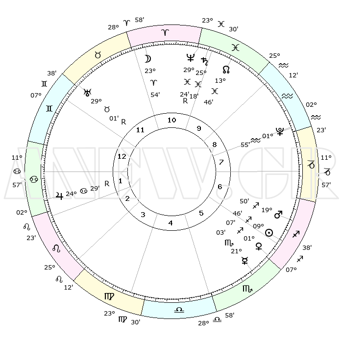 | | ΘΕΣΕΙΣ ΠΛΑΝΗΤΩΝ ΑΣΤΡΟΛΟΓΙΚΟΥ ΧΑΡΤΗ ΤΗΣ ΣΤΙΓΜΗΣ ΑΥΤΗΣ | | | | Πλανήτης | Ζώδιο | Μοίρες | Δεκαήμ. | Σε οίκο | Απόκλιση | | Ακμές των οίκων | | Ηλιος | Τοξότης | 09°44' | Πρώτο | 6 | 21 S 54 | | 1ος | 29°45' | Δίδυμοι | | Σελήνη | Κριός | 23°21' | Τρίτο | 11 | 12 N 01 | | 2ος | 20°33' | Καρκίνος | | Ερμής | Σκορπιός | 21°02' | Τρίτο | 5 | 15 S 29 | | 3ος | 12°20' | Λέων | | Αφροδίτη | Τοξότης | 01°04' | Πρώτο | 6 | 19 S 42 | | 4ος | 08°37' | Παρθένος | | Αρης | Τοξότης | 19°49' | Δεύτερο | 6 | 23 S 43 | | 5ος | 12°31' | Ζυγός | | Δίας | Καρκίνος | 24°29'R | Τρίτο | 2 | 21 N 23 | | 6ος | 22°32' | Σκορπιός | | Κρόνος | Ιχθείς | 25°18' | Τρίτο | 10 | 04 S 03 | | 7ος | 29°45' | Τοξότης | | Ουρανός | Ταύρος | 29°01'R | Τρίτο | 12 | 19 N 44 | | 8ος | 20°33' | Αιγόκερως | | Ποσειδώνας | Ιχθείς | 29°24'R | Τρίτο | 10 | 01 S 29 | | 9ος | 12°20' | Υδροχόος | | Πλούτωνας | Υδροχόος | 01°55' | Πρώτο | 8 | 23 S 24 | | 10ος | 08°37' | Ιχθείς | | Β. Δεσμός | Ιχθείς | 13°46' | Δεύτερο | 10 | 06 S 23 | | 11ος | 12°31' | Κριός | | Ωροσκόπος | Δίδυμοι | 29°45' | Τρίτο | | | 12ος | 22°32' | Ταύρος | | Μεσουράνημα | Ιχθείς | 08°37' | Πρώτο | | | |