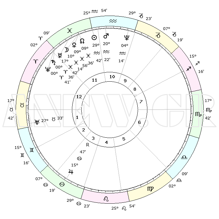 | | ΘΕΣΕΙΣ ΠΛΑΝΗΤΩΝ ΑΣΤΡΟΛΟΓΙΚΟΥ ΧΑΡΤΗ ΤΗΣ ΣΤΙΓΜΗΣ ΑΥΤΗΣ | | | | Πλανήτης | Ζώδιο | Μοίρες | Δεκαήμ. | Σε οίκο | Απόκλιση | | Ακμές των οίκων | | Ηλιος | Υδροχόος | 29°37' | Τρίτο | 12 | 11 S 36 | | 1ος | 03°12' | Κριός | | Σελήνη | Ιχθείς | 09°09' | Πρώτο | 12 | 08 S 07 | | 2ος | 12°42' | Ταύρος | | Ερμής | Ιχθείς | 17°36' | Δεύτερο | 12 | 04 S 09 | | 3ος | 09°37' | Δίδυμοι | | Αφροδίτη | Ιχθείς | 09°50' | Πρώτο | 12 | 09 S 14 | | 4ος | 01°48' | Καρκίνος | | Αρης | Υδροχόος | 20°18' | Τρίτο | 11 | 15 S 45 | | 5ος | 24°15' | Καρκίνος | | Δίας | Καρκίνος | 15°47'R | Δεύτερο | 4 | 22 N 50 | | 6ος | 22°09' | Λέων | | Κρόνος | Κριός | 00°35' | Πρώτο | 12 | 01 S 44 | | 7ος | 03°12' | Ζυγός | | Ουρανός | Ταύρος | 27°33' | Τρίτο | 2 | 19 N 26 | | 8ος | 12°42' | Σκορπιός | | Ποσειδώνας | Κριός | 00°41' | Πρώτο | 12 | 00 S 56 | | 9ος | 09°37' | Τοξότης | | Πλούτωνας | Υδροχόος | 04°14' | Πρώτο | 11 | 22 S 56 | | 10ος | 01°48' | Αιγόκερως | | Β. Δεσμός | Ιχθείς | 09°37' | Πρώτο | 12 | 07 S 58 | | 11ος | 24°15' | Αιγόκερως | | Ωροσκόπος | Κριός | 03°12' | Πρώτο | | | 12ος | 22°09' | Υδροχόος | | Μεσουράνημα | Αιγόκερως | 01°48' | Πρώτο | | | |