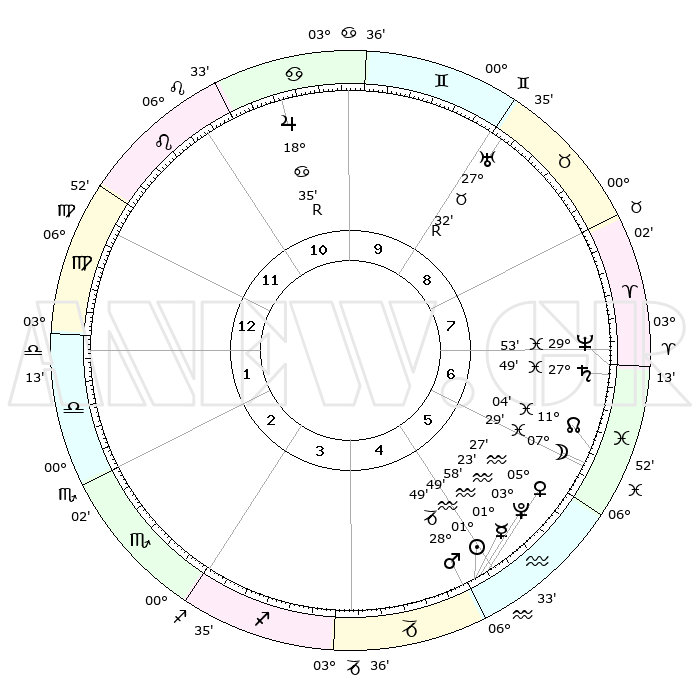 | | ΘΕΣΕΙΣ ΠΛΑΝΗΤΩΝ ΑΣΤΡΟΛΟΓΙΚΟΥ ΧΑΡΤΗ ΤΗΣ ΣΤΙΓΜΗΣ ΑΥΤΗΣ | | | | Πλανήτης | Ζώδιο | Μοίρες | Δεκαήμ. | Σε οίκο | Απόκλιση | | Ακμές των οίκων | | Ηλιος | Υδροχόος | 01°45' | Πρώτο | 5 | 19 S 46 | | 1ος | 12°21' | Παρθένος | | Σελήνη | Ιχθείς | 06°33' | Πρώτο | 6 | 09 S 21 | | 2ος | 07°27' | Ζυγός | | Ερμής | Υδροχόος | 01°51' | Πρώτο | 5 | 21 S 45 | | 3ος | 07°03' | Σκορπιός | | Αφροδίτη | Υδροχόος | 05°22' | Πρώτο | 5 | 20 S 03 | | 4ος | 09°60' | Τοξότης | | Αρης | Αιγόκερως | 28°46' | Τρίτο | 5 | 21 S 23 | | 5ος | 13°29' | Αιγόκερως | | Δίας | Καρκίνος | 18°35'R | Δεύτερο | 11 | 22 N 26 | | 6ος | 14°39' | Υδροχόος | | Κρόνος | Ιχθείς | 27°48' | Τρίτο | 7 | 02 S 53 | | 7ος | 12°21' | Ιχθείς | | Ουρανός | Ταύρος | 27°32'R | Τρίτο | 9 | 19 N 25 | | 8ος | 07°27' | Κριός | | Ποσειδώνας | Ιχθείς | 29°53' | Τρίτο | 7 | 01 S 15 | | 9ος | 07°03' | Ταύρος | | Πλούτωνας | Υδροχόος | 03°23' | Πρώτο | 5 | 23 S 05 | | 10ος | 09°60' | Δίδυμοι | | Β. Δεσμός | Ιχθείς | 11°04' | Δεύτερο | 6 | 07 S 25 | | 11ος | 13°29' | Καρκίνος | | Ωροσκόπος | Παρθένος | 12°21' | Δεύτερο | | | 12ος | 14°39' | Λέων | | Μεσουράνημα | Δίδυμοι | 09°60' | Πρώτο | | | |