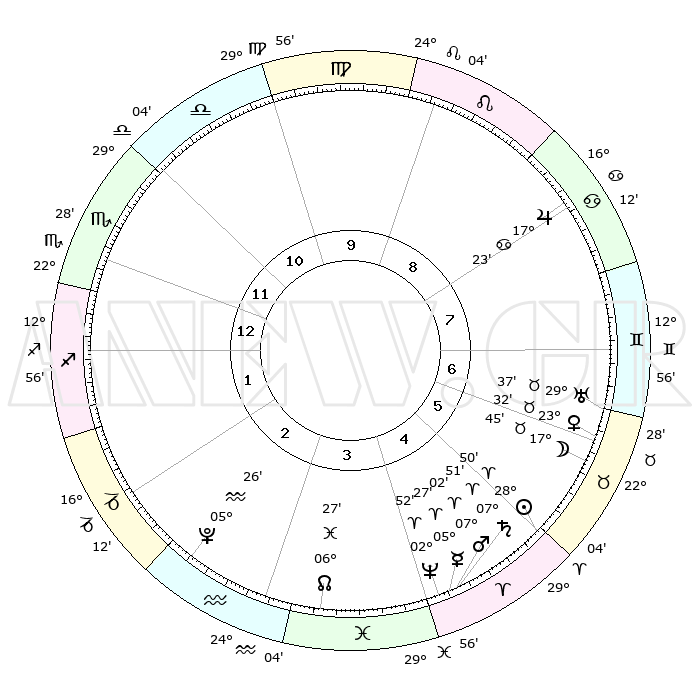 | | ΘΕΣΕΙΣ ΠΛΑΝΗΤΩΝ ΑΣΤΡΟΛΟΓΙΚΟΥ ΧΑΡΤΗ ΤΗΣ ΣΤΙΓΜΗΣ ΑΥΤΗΣ | | | | Πλανήτης | Ζώδιο | Μοίρες | Δεκαήμ. | Σε οίκο | Απόκλιση | | Ακμές των οίκων | | Ηλιος | Κριός | 28°45' | Τρίτο | 5 | 11 N 02 | | 1ος | 21°15' | Σκορπιός | | Σελήνη | Ταύρος | 16°39' | Δεύτερο | 6 | 21 N 22 | | 2ος | 21°19' | Τοξότης | | Ερμής | Κριός | 05°20' | Πρώτο | 5 | 00 S 18 | | 3ος | 25°39' | Αιγόκερως | | Αφροδίτη | Ταύρος | 23°27' | Τρίτο | 7 | 18 N 58 | | 4ος | 01°20' | Ιχθείς | | Αρης | Κριός | 06°58' | Πρώτο | 5 | 01 N 53 | | 5ος | 03°18' | Κριός | | Δίας | Καρκίνος | 17°22' | Δεύτερο | 8 | 22 N 41 | | 6ος | 29°32' | Κριός | | Κρόνος | Κριός | 07°50' | Πρώτο | 5 | 01 N 08 | | 7ος | 21°15' | Ταύρος | | Ουρανός | Ταύρος | 29°37' | Τρίτο | 7 | 19 N 54 | | 8ος | 21°19' | Δίδυμοι | | Ποσειδώνας | Κριός | 02°51' | Πρώτο | 4 | 00 S 04 | | 9ος | 25°39' | Καρκίνος | | Πλούτωνας | Υδροχόος | 05°26' | Πρώτο | 3 | 22 S 47 | | 10ος | 01°20' | Παρθένος | | Β. Δεσμός | Ιχθείς | 06°28' | Πρώτο | 4 | 09 S 08 | | 11ος | 03°18' | Ζυγός | | Ωροσκόπος | Σκορπιός | 21°15' | Τρίτο | | | 12ος | 29°32' | Ζυγός | | Μεσουράνημα | Παρθένος | 01°20' | Πρώτο | | | |