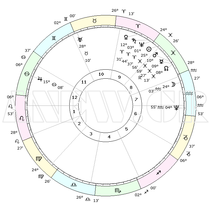 | | ΘΕΣΕΙΣ ΠΛΑΝΗΤΩΝ ΑΣΤΡΟΛΟΓΙΚΟΥ ΧΑΡΤΗ ΤΗΣ ΣΤΙΓΜΗΣ ΑΥΤΗΣ | | | | Πλανήτης | Ζώδιο | Μοίρες | Δεκαήμ. | Σε οίκο | Απόκλιση | | Ακμές των οίκων | | Ηλιος | Ιχθείς | 25°52' | Τρίτο | 9 | 01 S 38 | | 1ος | 19°20' | Καρκίνος | | Σελήνη | Υδροχόος | 23°16' | Τρίτο | 8 | 15 S 07 | | 2ος | 09°51' | Λέων | | Ερμής | Ιχθείς | 09°28'R | Πρώτο | 9 | 06 S 06 | | 3ος | 03°30' | Παρθένος | | Αφροδίτη | Κριός | 12°27' | Δεύτερο | 10 | 04 N 00 | | 4ος | 03°01' | Ζυγός | | Αρης | Ιχθείς | 10°56' | Δεύτερο | 9 | 08 S 28 | | 5ος | 08°58' | Σκορπιός | | Δίας | Καρκίνος | 15°08' | Δεύτερο | 12 | 22 N 56 | | 6ος | 16°29' | Τοξότης | | Κρόνος | Κριός | 03°44' | Πρώτο | 10 | 00 S 28 | | 7ος | 19°19' | Αιγόκερως | | Ουρανός | Ταύρος | 28°10' | Τρίτο | 11 | 19 N 34 | | 8ος | 09°51' | Υδροχόος | | Ποσειδώνας | Κριός | 01°37' | Πρώτο | 9 | 00 S 33 | | 9ος | 03°30' | Ιχθείς | | Πλούτωνας | Υδροχόος | 04°55' | Πρώτο | 7 | 22 S 49 | | 10ος | 03°01' | Κριός | | Β. Δεσμός | Ιχθείς | 08°14' | Πρώτο | 9 | 08 S 29 | | 11ος | 08°58' | Ταύρος | | Ωροσκόπος | Καρκίνος | 19°20' | Δεύτερο | | | 12ος | 16°29' | Δίδυμοι | | Μεσουράνημα | Κριός | 03°01' | Πρώτο | | | |