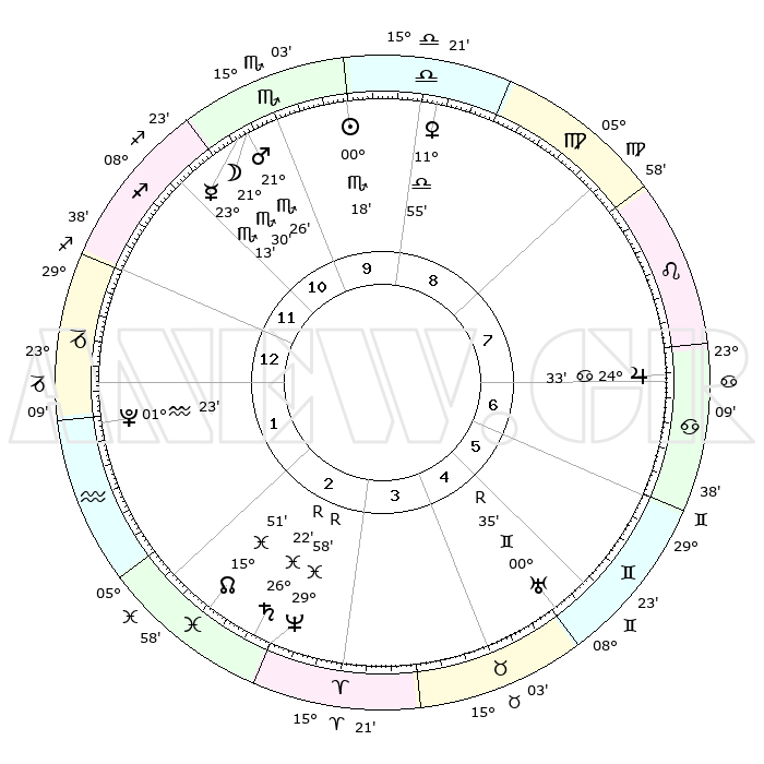 | | ΘΕΣΕΙΣ ΠΛΑΝΗΤΩΝ ΑΣΤΡΟΛΟΓΙΚΟΥ ΧΑΡΤΗ ΤΗΣ ΣΤΙΓΜΗΣ ΑΥΤΗΣ | | | | Πλανήτης | Ζώδιο | Μοίρες | Δεκαήμ. | Σε οίκο | Απόκλιση | | Ακμές των οίκων | | Ηλιος | Σκορπιός | 00°10' | Πρώτο | 11 | 11 S 32 | | 1ος | 08°59' | Τοξότης | | Σελήνη | Σκορπιός | 19°57' | Δεύτερο | 12 | 22 S 06 | | 2ος | 11°32' | Αιγόκερως | | Ερμής | Σκορπιός | 23°03' | Τρίτο | 12 | 20 S 57 | | 3ος | 18°45' | Υδροχόος | | Αφροδίτη | Ζυγός | 11°45' | Δεύτερο | 10 | 03 S 14 | | 4ος | 24°46' | Ιχθείς | | Αρης | Σκορπιός | 21°20' | Τρίτο | 12 | 18 S 23 | | 5ος | 24°33' | Κριός | | Δίας | Καρκίνος | 24°33' | Τρίτο | 8 | 21 N 16 | | 6ος | 18°25' | Ταύρος | | Κρόνος | Ιχθείς | 26°22'R | Τρίτο | 4 | 03 S 43 | | 7ος | 08°59' | Δίδυμοι | | Ουρανός | Δίδυμοι | 00°35'R | Πρώτο | 6 | 20 N 04 | | 8ος | 11°32' | Καρκίνος | | Ποσειδώνας | Ιχθείς | 29°59'R | Τρίτο | 4 | 01 S 16 | | 9ος | 18°45' | Λέων | | Πλούτωνας | Υδροχόος | 01°23' | Πρώτο | 2 | 23 S 32 | | 10ος | 24°47' | Παρθένος | | Β. Δεσμός | Ιχθείς | 15°51' | Δεύτερο | 3 | 05 S 35 | | 11ος | 24°33' | Ζυγός | | Ωροσκόπος | Τοξότης | 08°59' | Πρώτο | | | 12ος | 18°25' | Σκορπιός | | Μεσουράνημα | Παρθένος | 24°47' | Τρίτο | | | |