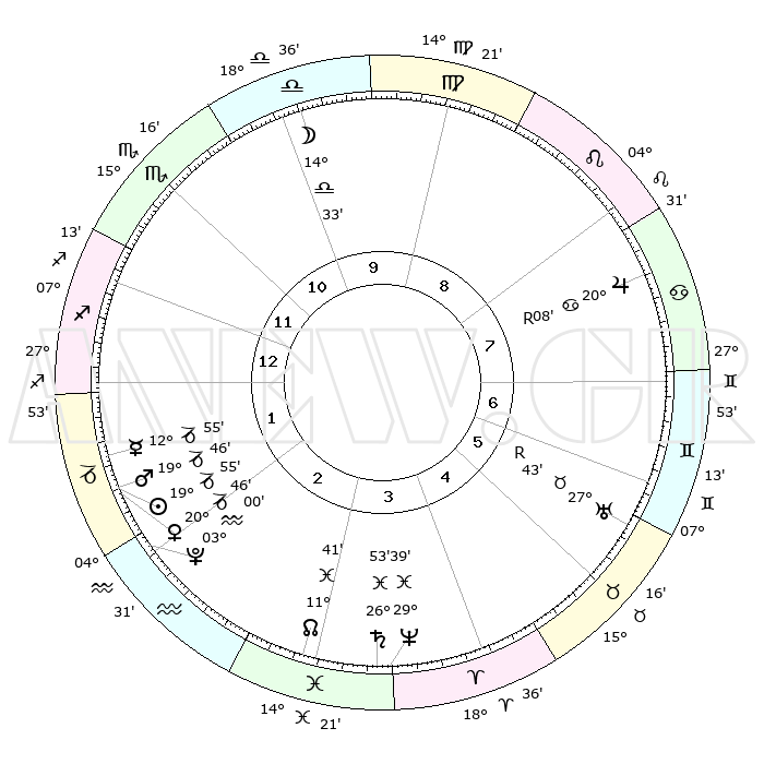 | | ΘΕΣΕΙΣ ΠΛΑΝΗΤΩΝ ΑΣΤΡΟΛΟΓΙΚΟΥ ΧΑΡΤΗ ΤΗΣ ΣΤΙΓΜΗΣ ΑΥΤΗΣ | | | | Πλανήτης | Ζώδιο | Μοίρες | Δεκαήμ. | Σε οίκο | Απόκλιση | | Ακμές των οίκων | | Ηλιος | Αιγόκερως | 19°24' | Δεύτερο | 6 | 22 S 02 | | 1ος | 26°14' | Καρκίνος | | Σελήνη | Ζυγός | 08°13' | Πρώτο | 3 | 05 S 28 | | 2ος | 17°03' | Λέων | | Ερμής | Αιγόκερως | 12°06' | Δεύτερο | 6 | 24 S 17 | | 3ος | 11°36' | Παρθένος | | Αφροδίτη | Αιγόκερως | 20°07' | Τρίτο | 6 | 22 S 44 | | 4ος | 12°08' | Ζυγός | | Αρης | Αιγόκερως | 19°22' | Δεύτερο | 6 | 22 S 58 | | 5ος | 18°14' | Σκορπιός | | Δίας | Καρκίνος | 20°12'R | Τρίτο | 12 | 22 N 10 | | 6ος | 24°34' | Τοξότης | | Κρόνος | Ιχθείς | 26°51' | Τρίτο | 9 | 03 S 18 | | 7ος | 26°14' | Αιγόκερως | | Ουρανός | Ταύρος | 27°44'R | Τρίτο | 11 | 19 N 28 | | 8ος | 17°03' | Υδροχόος | | Ποσειδώνας | Ιχθείς | 29°38' | Τρίτο | 9 | 01 S 22 | | 9ος | 11°36' | Ιχθείς | | Πλούτωνας | Υδροχόος | 02°59' | Πρώτο | 7 | 23 S 10 | | 10ος | 12°08' | Κριός | | Β. Δεσμός | Ιχθείς | 11°43' | Δεύτερο | 9 | 07 S 10 | | 11ος | 18°14' | Ταύρος | | Ωροσκόπος | Καρκίνος | 26°14' | Τρίτο | | | 12ος | 24°34' | Δίδυμοι | | Μεσουράνημα | Κριός | 12°08' | Δεύτερο | | | |