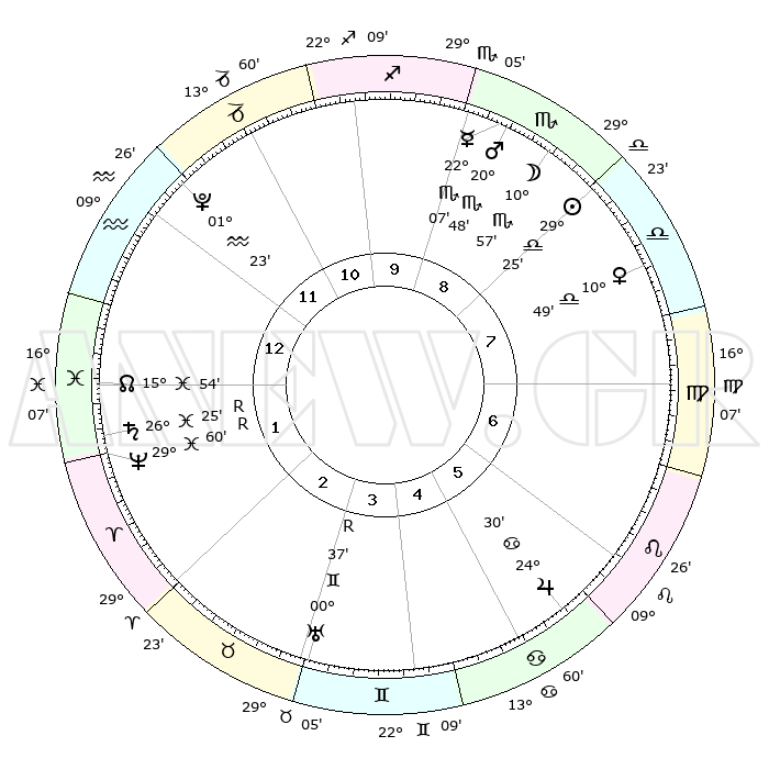 | ΘΕΣΕΙΣ ΠΛΑΝΗΤΩΝ ΑΣΤΡΟΛΟΓΙΚΟΥ ΧΑΡΤΗ ΤΗΣ ΣΤΙΓΜΗΣ ΑΥΤΗΣ | | Πλανήτης | Ζώδιο | Μοίρες | Δεκαήμ. | Σε οίκο | Απόκλιση | | Ακμές των οίκων | Ηλιος | Ζυγός | 29°19' | Τρίτο | 9 | 11 S 14 | | 1ος | 29°10' | Αιγόκερως | Σελήνη | Σκορπιός | 09°51' | Πρώτο | 9 | 18 S 37 | | 2ος | 13°07' | Ιχθείς | Ερμής | Σκορπιός | 21°60' | Τρίτο | 10 | 20 S 37 | | 3ος | 21°42' | Κριός | Αφροδίτη | Ζυγός | 10°42' | Δεύτερο | 8 | 02 S 49 | | 4ος | 20°18' | Ταύρος | Αρης | Σκορπιός | 20°44' | Τρίτο | 10 | 18 S 13 | | 5ος | 13°08' | Δίδυμοι | Δίας | Καρκίνος | 24°30' | Τρίτο | 6 | 21 N 17 | | 6ος | 04°31' | Καρκίνος | Κρόνος | Ιχθείς | 26°25'R | Τρίτο | 2 | 03 S 42 | | 7ος | 29°10' | Καρκίνος | Ουρανός | Δίδυμοι | 00°37'R | Πρώτο | 4 | 20 N 04 | | 8ος | 13°07' | Παρθένος | Ποσειδώνας | Ιχθείς | 29°60' | Τρίτο | 2 | 01 S 16 | | 9ος | 21°42' | Ζυγός | Πλούτωνας | Υδροχόος | 01°23' | Πρώτο | 1 | 23 S 32 | | 10ος | 20°18' | Σκορπιός | Β. Δεσμός | Ιχθείς | 15°54' | Δεύτερο | 2 | 05 S 33 | | 11ος | 13°08' | Τοξότης | Ωροσκόπος | Αιγόκερως | 29°10' | Τρίτο | | | 12ος | 04°31' | Αιγόκερως | Μεσουράνημα | Σκορπιός | 20°18' | Τρίτο | | | |
