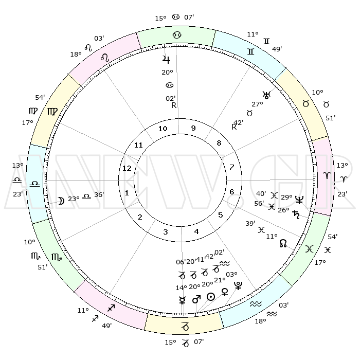 | | ΘΕΣΕΙΣ ΠΛΑΝΗΤΩΝ ΑΣΤΡΟΛΟΓΙΚΟΥ ΧΑΡΤΗ ΤΗΣ ΣΤΙΓΜΗΣ ΑΥΤΗΣ | | | | Πλανήτης | Ζώδιο | Μοίρες | Δεκαήμ. | Σε οίκο | Απόκλιση | | Ακμές των οίκων | | Ηλιος | Αιγόκερως | 20°01' | Τρίτο | 12 | 21 S 57 | | 1ος | 29°19' | Αιγόκερως | | Σελήνη | Ζυγός | 15°36' | Δεύτερο | 8 | 08 S 52 | | 2ος | 13°18' | Ιχθείς | | Ερμής | Αιγόκερως | 13°03' | Δεύτερο | 12 | 24 S 15 | | 3ος | 21°52' | Κριός | | Αφροδίτη | Αιγόκερως | 20°52' | Τρίτο | 12 | 22 S 38 | | 4ος | 20°26' | Ταύρος | | Αρης | Αιγόκερως | 19°49' | Δεύτερο | 12 | 22 S 54 | | 5ος | 13°15' | Δίδυμοι | | Δίας | Καρκίνος | 20°07'R | Τρίτο | 6 | 22 N 11 | | 6ος | 04°39' | Καρκίνος | | Κρόνος | Ιχθείς | 26°53' | Τρίτο | 2 | 03 S 17 | | 7ος | 29°19' | Καρκίνος | | Ουρανός | Ταύρος | 27°43'R | Τρίτο | 4 | 19 N 27 | | 8ος | 13°18' | Παρθένος | | Ποσειδώνας | Ιχθείς | 29°39' | Τρίτο | 2 | 01 S 21 | | 9ος | 21°52' | Ζυγός | | Πλούτωνας | Υδροχόος | 03°00' | Πρώτο | 1 | 23 S 10 | | 10ος | 20°26' | Σκορπιός | | Β. Δεσμός | Ιχθείς | 11°41' | Δεύτερο | 1 | 07 S 11 | | 11ος | 13°15' | Τοξότης | | Ωροσκόπος | Αιγόκερως | 29°19' | Τρίτο | | | 12ος | 04°39' | Αιγόκερως | | Μεσουράνημα | Σκορπιός | 20°26' | Τρίτο | | | |