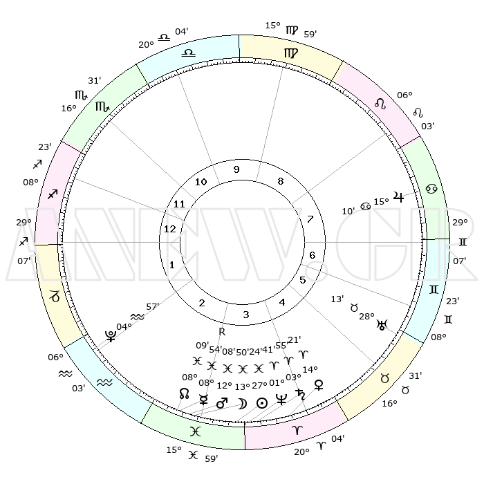 | | ΘΕΣΕΙΣ ΠΛΑΝΗΤΩΝ ΑΣΤΡΟΛΟΓΙΚΟΥ ΧΑΡΤΗ ΤΗΣ ΣΤΙΓΜΗΣ ΑΥΤΗΣ | | | | Πλανήτης | Ζώδιο | Μοίρες | Δεκαήμ. | Σε οίκο | Απόκλιση | | Ακμές των οίκων | | Ηλιος | Ιχθείς | 27°20' | Τρίτο | 4 | 01 S 03 | | 1ος | 08°60' | Τοξότης | | Σελήνη | Ιχθείς | 12°57' | Δεύτερο | 3 | 06 S 22 | | 2ος | 11°32' | Αιγόκερως | | Ερμής | Ιχθείς | 08°55'R | Πρώτο | 3 | 06 S 39 | | 3ος | 18°46' | Υδροχόος | | Αφροδίτη | Κριός | 14°16' | Δεύτερο | 4 | 04 N 45 | | 4ος | 24°47' | Ιχθείς | | Αρης | Ιχθείς | 12°05' | Δεύτερο | 3 | 08 S 01 | | 5ος | 24°33' | Κριός | | Δίας | Καρκίνος | 15°10' | Δεύτερο | 8 | 22 N 56 | | 6ος | 18°25' | Ταύρος | | Κρόνος | Κριός | 03°54' | Πρώτο | 4 | 00 S 24 | | 7ος | 08°60' | Δίδυμοι | | Ουρανός | Ταύρος | 28°13' | Τρίτο | 6 | 19 N 35 | | 8ος | 11°32' | Καρκίνος | | Ποσειδώνας | Κριός | 01°41' | Πρώτο | 4 | 00 S 32 | | 9ος | 18°46' | Λέων | | Πλούτωνας | Υδροχόος | 04°57' | Πρώτο | 2 | 22 S 49 | | 10ος | 24°47' | Παρθένος | | Β. Δεσμός | Ιχθείς | 08°09' | Πρώτο | 3 | 08 S 31 | | 11ος | 24°33' | Ζυγός | | Ωροσκόπος | Τοξότης | 08°60' | Πρώτο | | | 12ος | 18°25' | Σκορπιός | | Μεσουράνημα | Παρθένος | 24°47' | Τρίτο | | | |