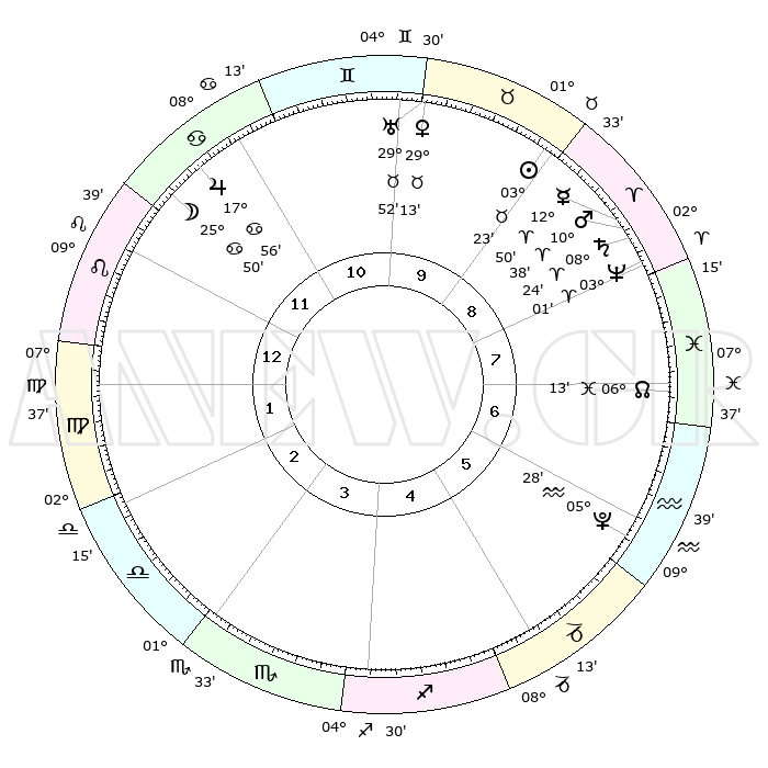 | | ΘΕΣΕΙΣ ΠΛΑΝΗΤΩΝ ΑΣΤΡΟΛΟΓΙΚΟΥ ΧΑΡΤΗ ΤΗΣ ΣΤΙΓΜΗΣ ΑΥΤΗΣ | | | | Πλανήτης | Ζώδιο | Μοίρες | Δεκαήμ. | Σε οίκο | Απόκλιση | | Ακμές των οίκων | | Ηλιος | Ταύρος | 03°19' | Πρώτο | 9 | 12 N 37 | | 1ος | 21°39' | Λέων | | Σελήνη | Καρκίνος | 25°04' | Τρίτο | 12 | 24 N 30 | | 2ος | 14°38' | Παρθένος | | Ερμής | Κριός | 12°45' | Δεύτερο | 9 | 02 N 43 | | 3ος | 12°27' | Ζυγός | | Αφροδίτη | Ταύρος | 29°09' | Τρίτο | 10 | 20 N 31 | | 4ος | 15°11' | Σκορπιός | | Αρης | Κριός | 10°35' | Δεύτερο | 8 | 03 N 20 | | 5ος | 19°59' | Τοξότης | | Δίας | Καρκίνος | 17°56' | Δεύτερο | 11 | 22 N 37 | | 6ος | 22°42' | Αιγόκερως | | Κρόνος | Κριός | 08°24' | Πρώτο | 8 | 01 N 21 | | 7ος | 21°39' | Υδροχόος | | Ουρανός | Ταύρος | 29°52' | Τρίτο | 10 | 19 N 57 | | 8ος | 14°38' | Ιχθείς | | Ποσειδώνας | Κριός | 03°01' | Πρώτο | 8 | 00 S 00 | | 9ος | 12°27' | Κριός | | Πλούτωνας | Υδροχόος | 05°28' | Πρώτο | 6 | 22 S 48 | | 10ος | 15°11' | Ταύρος | | Β. Δεσμός | Ιχθείς | 06°13' | Πρώτο | 7 | 09 S 14 | | 11ος | 19°59' | Δίδυμοι | | Ωροσκόπος | Λέων | 21°39' | Τρίτο | | | 12ος | 22°42' | Καρκίνος | | Μεσουράνημα | Ταύρος | 15°11' | Δεύτερο | | | |