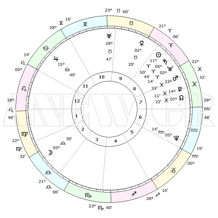 | | ΘΕΣΕΙΣ ΠΛΑΝΗΤΩΝ ΑΣΤΡΟΛΟΓΙΚΟΥ ΧΑΡΤΗ ΤΗΣ ΣΤΙΓΜΗΣ ΑΥΤΗΣ | | | | Πλανήτης | Ζώδιο | Μοίρες | Δεκαήμ. | Σε οίκο | Απόκλιση | | Ακμές των οίκων | | Ηλιος | Κριός | 11°46' | Δεύτερο | 9 | 04 N 39 | | 1ος | 10°06' | Λέων | | Σελήνη | Ζυγός | 04°41' | Πρώτο | 3 | 03 S 57 | | 2ος | 01°56' | Παρθένος | | Ερμής | Ιχθείς | 14°07' | Δεύτερο | 8 | 07 S 31 | | 3ος | 28°20' | Παρθένος | | Αφροδίτη | Ταύρος | 02°15' | Πρώτο | 10 | 11 N 51 | | 4ος | 00°25' | Σκορπιός | | Αρης | Ιχθείς | 23°30' | Τρίτο | 8 | 03 S 32 | | 5ος | 06°01' | Τοξότης | | Δίας | Καρκίνος | 15°49' | Δεύτερο | 12 | 22 N 52 | | 6ος | 10°09' | Αιγόκερως | | Κρόνος | Κριός | 05°43' | Πρώτο | 9 | 00 N 19 | | 7ος | 10°06' | Υδροχόος | | Ουρανός | Ταύρος | 28°47' | Τρίτο | 10 | 19 N 43 | | 8ος | 01°56' | Ιχθείς | | Ποσειδώνας | Κριός | 02°14' | Πρώτο | 9 | 00 S 19 | | 9ος | 28°20' | Ιχθείς | | Πλούτωνας | Υδροχόος | 05°14' | Πρώτο | 6 | 22 S 47 | | 10ος | 00°25' | Ταύρος | | Β. Δεσμός | Ιχθείς | 07°23' | Πρώτο | 8 | 08 S 48 | | 11ος | 06°01' | Δίδυμοι | | Ωροσκόπος | Λέων | 10°06' | Δεύτερο | | | 12ος | 10°09' | Καρκίνος | | Μεσουράνημα | Ταύρος | 00°25' | Πρώτο | | | |