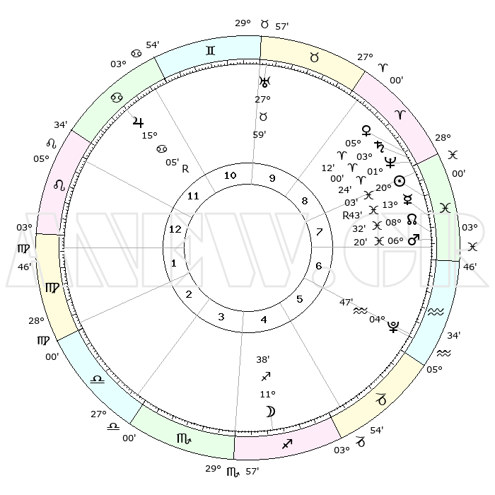 | | ΘΕΣΕΙΣ ΠΛΑΝΗΤΩΝ ΑΣΤΡΟΛΟΓΙΚΟΥ ΧΑΡΤΗ ΤΗΣ ΣΤΙΓΜΗΣ ΑΥΤΗΣ | | | | Πλανήτης | Ζώδιο | Μοίρες | Δεκαήμ. | Σε οίκο | Απόκλιση | | Ακμές των οίκων | | Ηλιος | Ιχθείς | 20°00' | Τρίτο | 8 | 03 S 58 | | 1ος | 18°14' | Λέων | | Σελήνη | Τοξότης | 10°59' | Δεύτερο | 4 | 27 S 18 | | 2ος | 10°51' | Παρθένος | | Ερμής | Ιχθείς | 13°46'R | Δεύτερο | 8 | 03 S 20 | | 3ος | 08°18' | Ζυγός | | Αφροδίτη | Κριός | 05°08' | Πρώτο | 8 | 00 N 58 | | 4ος | 10°53' | Σκορπιός | | Αρης | Ιχθείς | 06°18' | Πρώτο | 7 | 10 S 13 | | 5ος | 15°56' | Τοξότης | | Δίας | Καρκίνος | 15°05'R | Δεύτερο | 11 | 22 N 56 | | 6ος | 19°01' | Αιγόκερως | | Κρόνος | Κριός | 02°60' | Πρώτο | 8 | 00 S 46 | | 7ος | 18°14' | Υδροχόος | | Ουρανός | Ταύρος | 27°59' | Τρίτο | 10 | 19 N 32 | | 8ος | 10°51' | Ιχθείς | | Ποσειδώνας | Κριός | 01°24' | Πρώτο | 8 | 00 S 39 | | 9ος | 08°18' | Κριός | | Πλούτωνας | Υδροχόος | 04°47' | Πρώτο | 6 | 22 S 50 | | 10ος | 10°53' | Ταύρος | | Β. Δεσμός | Ιχθείς | 08°32' | Πρώτο | 7 | 08 S 22 | | 11ος | 15°56' | Δίδυμοι | | Ωροσκόπος | Λέων | 18°14' | Δεύτερο | | | 12ος | 19°01' | Καρκίνος | | Μεσουράνημα | Ταύρος | 10°53' | Δεύτερο | | | |