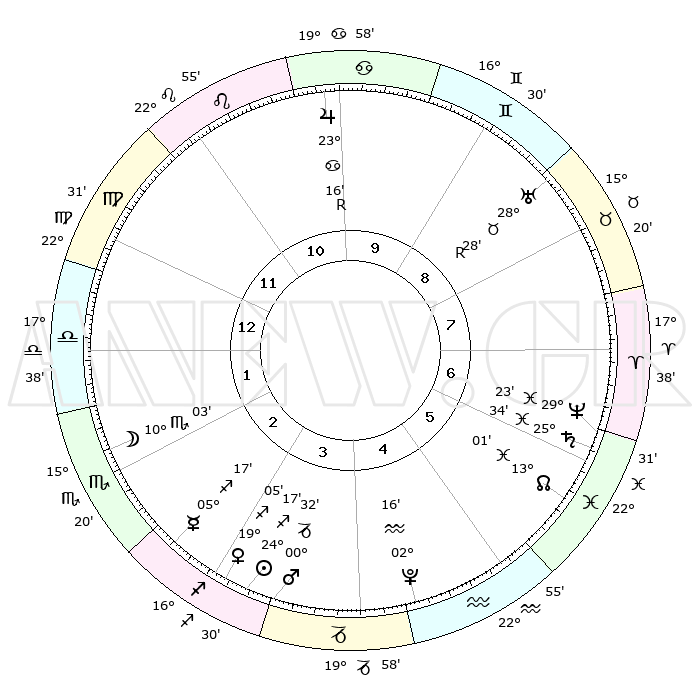 | | ΘΕΣΕΙΣ ΠΛΑΝΗΤΩΝ ΑΣΤΡΟΛΟΓΙΚΟΥ ΧΑΡΤΗ ΤΗΣ ΣΤΙΓΜΗΣ ΑΥΤΗΣ | | | | Πλανήτης | Ζώδιο | Μοίρες | Δεκαήμ. | Σε οίκο | Απόκλιση | | Ακμές των οίκων | | Ηλιος | Τοξότης | 24°02' | Τρίτο | 5 | 23 S 18 | | 1ος | 07°20' | Λέων | | Σελήνη | Σκορπιός | 07°12' | Πρώτο | 4 | 17 S 46 | | 2ος | 28°56' | Λέων | | Ερμής | Τοξότης | 04°58' | Πρώτο | 5 | 19 S 42 | | 3ος | 24°58' | Παρθένος | | Αφροδίτη | Τοξότης | 18°47' | Δεύτερο | 5 | 22 S 50 | | 4ος | 26°48' | Ζυγός | | Αρης | Αιγόκερως | 00°21' | Πρώτο | 5 | 24 S 13 | | 5ος | 02°34' | Τοξότης | | Δίας | Καρκίνος | 23°17'R | Τρίτο | 12 | 21 N 37 | | 6ος | 07°07' | Αιγόκερως | | Κρόνος | Ιχθείς | 25°33' | Τρίτο | 9 | 03 S 54 | | 7ος | 07°20' | Υδροχόος | | Ουρανός | Ταύρος | 28°28'R | Τρίτο | 10 | 19 N 37 | | 8ος | 28°56' | Υδροχόος | | Ποσειδώνας | Ιχθείς | 29°23' | Τρίτο | 9 | 01 S 29 | | 9ος | 24°58' | Ιχθείς | | Πλούτωνας | Υδροχόος | 02°16' | Πρώτο | 6 | 23 S 19 | | 10ος | 26°48' | Κριός | | Β. Δεσμός | Ιχθείς | 13°02' | Δεύτερο | 8 | 06 S 40 | | 11ος | 02°34' | Δίδυμοι | | Ωροσκόπος | Λέων | 07°20' | Πρώτο | | | 12ος | 07°07' | Καρκίνος | | Μεσουράνημα | Κριός | 26°48' | Τρίτο | | | |