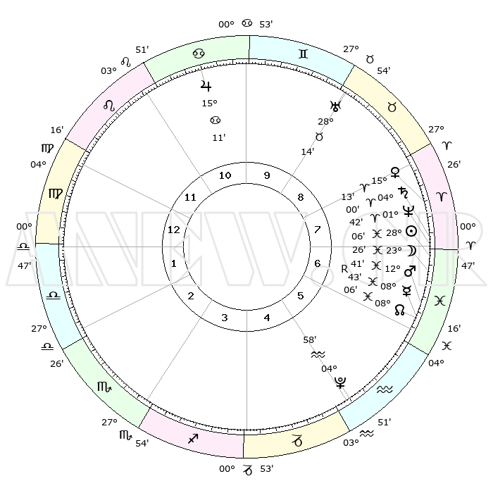 | | ΘΕΣΕΙΣ ΠΛΑΝΗΤΩΝ ΑΣΤΡΟΛΟΓΙΚΟΥ ΧΑΡΤΗ ΤΗΣ ΣΤΙΓΜΗΣ ΑΥΤΗΣ | | | | Πλανήτης | Ζώδιο | Μοίρες | Δεκαήμ. | Σε οίκο | Απόκλιση | | Ακμές των οίκων | | Ηλιος | Ιχθείς | 28°02' | Τρίτο | 7 | 00 S 47 | | 1ος | 09°44' | Παρθένος | | Σελήνη | Ιχθείς | 22°27' | Τρίτο | 7 | 01 S 52 | | 2ος | 04°35' | Ζυγός | | Ερμής | Ιχθείς | 08°44'R | Πρώτο | 6 | 06 S 53 | | 3ος | 04°01' | Σκορπιός | | Αφροδίτη | Κριός | 15°08' | Δεύτερο | 8 | 05 N 06 | | 4ος | 06°59' | Τοξότης | | Αρης | Ιχθείς | 12°38' | Δεύτερο | 7 | 07 S 49 | | 5ος | 10°35' | Αιγόκερως | | Δίας | Καρκίνος | 15°11' | Δεύτερο | 11 | 22 N 56 | | 6ος | 11°53' | Υδροχόος | | Κρόνος | Κριός | 03°60' | Πρώτο | 7 | 00 S 22 | | 7ος | 09°44' | Ιχθείς | | Ουρανός | Ταύρος | 28°14' | Τρίτο | 9 | 19 N 35 | | 8ος | 04°35' | Κριός | | Ποσειδώνας | Κριός | 01°42' | Πρώτο | 7 | 00 S 31 | | 9ος | 04°01' | Ταύρος | | Πλούτωνας | Υδροχόος | 04°58' | Πρώτο | 5 | 22 S 49 | | 10ος | 06°59' | Δίδυμοι | | Β. Δεσμός | Ιχθείς | 08°07' | Πρώτο | 6 | 08 S 32 | | 11ος | 10°35' | Καρκίνος | | Ωροσκόπος | Παρθένος | 09°44' | Πρώτο | | | 12ος | 11°53' | Λέων | | Μεσουράνημα | Δίδυμοι | 06°59' | Πρώτο | | | |