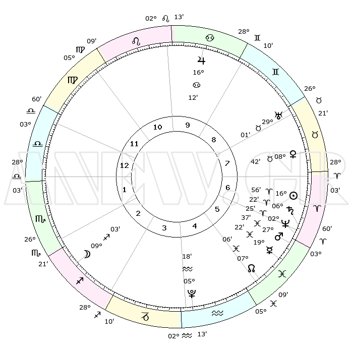 | | ΘΕΣΕΙΣ ΠΛΑΝΗΤΩΝ ΑΣΤΡΟΛΟΓΙΚΟΥ ΧΑΡΤΗ ΤΗΣ ΣΤΙΓΜΗΣ ΑΥΤΗΣ | | | | Πλανήτης | Ζώδιο | Μοίρες | Δεκαήμ. | Σε οίκο | Απόκλιση | | Ακμές των οίκων | | Ηλιος | Κριός | 16°52' | Δεύτερο | 7 | 06 N 38 | | 1ος | 08°18' | Ζυγός | | Σελήνη | Τοξότης | 08°15' | Πρώτο | 3 | 26 S 46 | | 2ος | 05°27' | Σκορπιός | | Ερμής | Ιχθείς | 19°17' | Δεύτερο | 6 | 06 S 07 | | 3ος | 06°13' | Τοξότης | | Αφροδίτη | Ταύρος | 08°38' | Πρώτο | 8 | 14 N 11 | | 4ος | 09°21' | Αιγόκερως | | Αρης | Ιχθείς | 27°33' | Τρίτο | 6 | 01 S 55 | | 5ος | 12°17' | Υδροχόος | | Δίας | Καρκίνος | 16°12' | Δεύτερο | 10 | 22 N 49 | | 6ος | 12°22' | Ιχθείς | | Κρόνος | Κριός | 06°22' | Πρώτο | 6 | 00 N 34 | | 7ος | 08°18' | Κριός | | Ουρανός | Ταύρος | 29°01' | Τρίτο | 8 | 19 N 46 | | 8ος | 05°27' | Ταύρος | | Ποσειδώνας | Κριός | 02°25' | Πρώτο | 6 | 00 S 14 | | 9ος | 06°13' | Δίδυμοι | | Πλούτωνας | Υδροχόος | 05°18' | Πρώτο | 4 | 22 S 47 | | 10ος | 09°21' | Καρκίνος | | Β. Δεσμός | Ιχθείς | 07°06' | Πρώτο | 5 | 08 S 54 | | 11ος | 12°17' | Λέων | | Ωροσκόπος | Ζυγός | 08°18' | Πρώτο | | | 12ος | 12°22' | Παρθένος | | Μεσουράνημα | Καρκίνος | 09°21' | Πρώτο | | | |