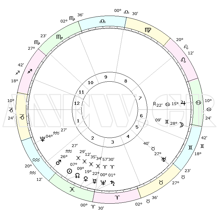 | | ΘΕΣΕΙΣ ΠΛΑΝΗΤΩΝ ΑΣΤΡΟΛΟΓΙΚΟΥ ΧΑΡΤΗ ΤΗΣ ΣΤΙΓΜΗΣ ΑΥΤΗΣ | | | | Πλανήτης | Ζώδιο | Μοίρες | Δεκαήμ. | Σε οίκο | Απόκλιση | | Ακμές των οίκων | | Ηλιος | Ιχθείς | 07°25' | Πρώτο | 3 | 08 S 47 | | 1ος | 18°21' | Τοξότης | | Σελήνη | Δίδυμοι | 27°12' | Τρίτο | 7 | 28 N 25 | | 2ος | 22°45' | Αιγόκερως | | Ερμής | Ιχθείς | 22°33' | Τρίτο | 3 | 00 S 27 | | 3ος | 01°28' | Ιχθείς | | Αφροδίτη | Ιχθείς | 19°30' | Δεύτερο | 3 | 05 S 26 | | 4ος | 06°54' | Κριός | | Αρης | Υδροχόος | 26°24' | Τρίτο | 2 | 13 S 44 | | 5ος | 05°09' | Ταύρος | | Δίας | Καρκίνος | 15°22'R | Δεύτερο | 7 | 22 N 53 | | 6ος | 27°56' | Ταύρος | | Κρόνος | Κριός | 01°29' | Πρώτο | 3 | 01 S 22 | | 7ος | 18°21' | Δίδυμοι | | Ουρανός | Ταύρος | 27°40' | Τρίτο | 5 | 19 N 28 | | 8ος | 22°45' | Καρκίνος | | Ποσειδώνας | Κριός | 00°57' | Πρώτο | 3 | 00 S 50 | | 9ος | 01°28' | Παρθένος | | Πλούτωνας | Υδροχόος | 04°27' | Πρώτο | 2 | 22 S 53 | | 10ος | 06°54' | Ζυγός | | Β. Δεσμός | Ιχθείς | 09°12' | Πρώτο | 3 | 08 S 07 | | 11ος | 05°09' | Σκορπιός | | Ωροσκόπος | Τοξότης | 18°21' | Δεύτερο | | | 12ος | 27°56' | Σκορπιός | | Μεσουράνημα | Ζυγός | 06°54' | Πρώτο | | | |